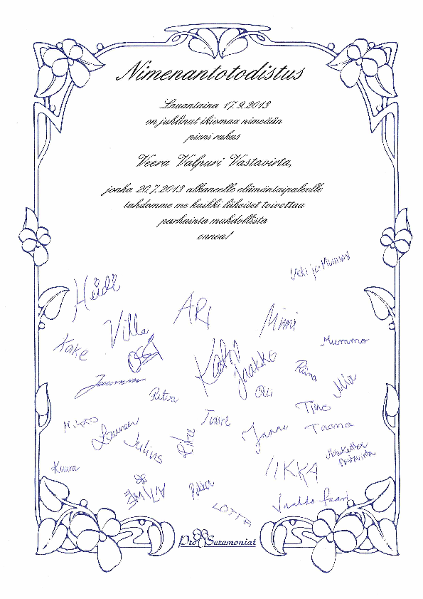 Nimenantotodistuksen allekirjoittamalla niin kummit, mummit kuin koko muukin juhlaväki pienimpiä myöten saa toivottaa lapselle onnea. Samalla todistus siis toimii 'vieraskirjana'. Todistusta riittää yksi kappale. (Huom! Muistathan kertoa lomakkeen lisätietoja-kohdassa, jos kyseessä on adoptiolapsen kotiintulojuhla, tai jos lapsen nimeä juhlitaan vasta 1-vuotissynttärien yhteydessä, sillä sekä näihin että monenlaisiin muihinkin tilanteisiin meillä on omat tekstiversionsa.) Todistuksen voi tilata myös kaksikielisenä, tai kummallakin kielellä oman todistuksen. Erilliset todistukset kannattaa tilata ainakin silloin kun juhlaväen määrä on suuri.