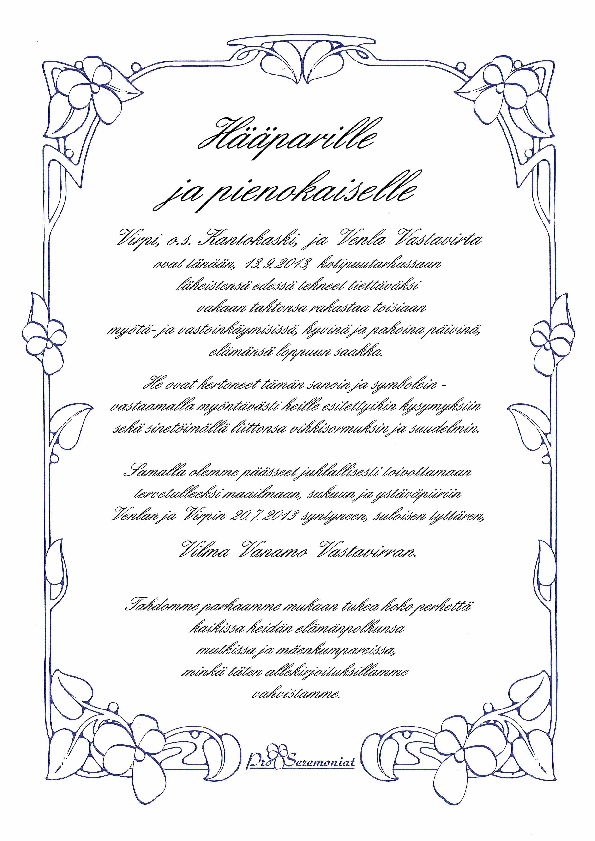 Mikäli jokin asia pohdituttaa, ota jo ennen tilauksen tekemistä yhteyttä toimistoomme sähköpostitse: posti@pro-seremoniat.fi tai puhelimitse: 050 590 4390.