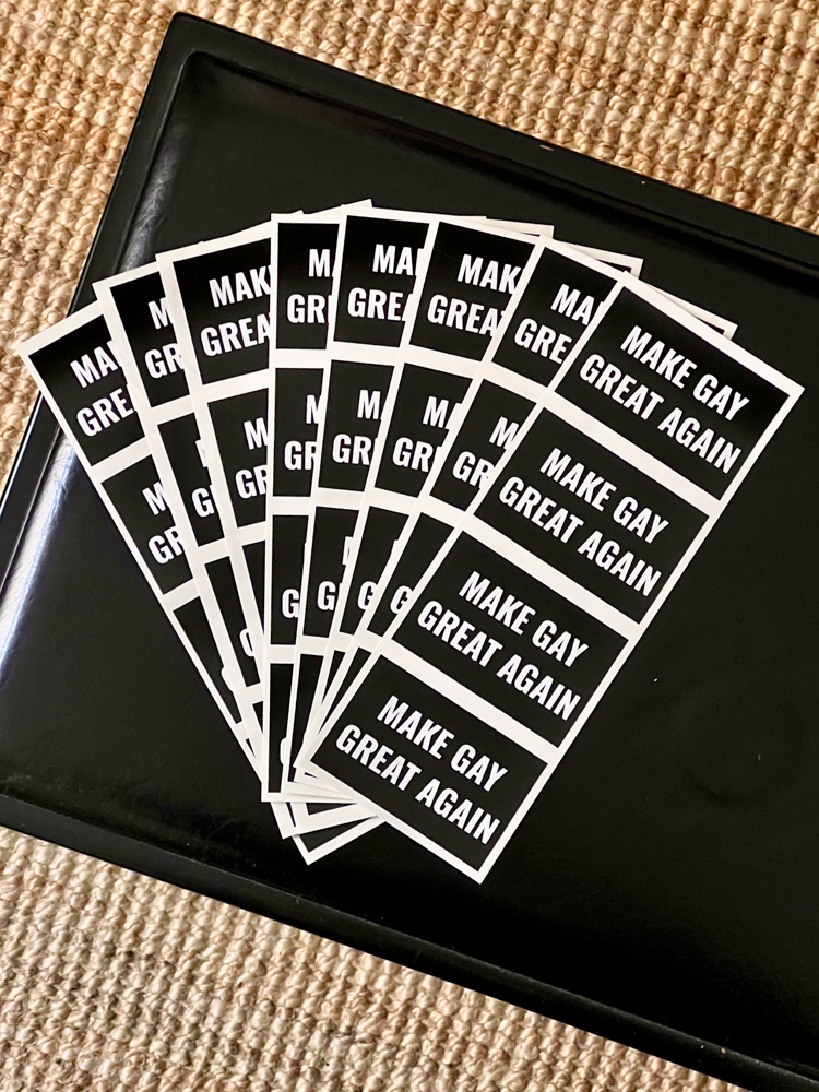 EL QUATRO GAYS -TARRAVIUHKA! LÄPPÄRIIN! MEIKKIPEILIIN! PÄDIIN! KIRJOIHIN, KANSIIN, TASOIHIN! HOMOSLOGANIEN YKKÖNEN NELJÄN TARRAN VIUHKANA. YKSI VIUHKA SISÄLTÄÄ NELJÄ MAKE GAY GREAT AGAIN (CLASSIC MUSTAVALKO) TARRAA. TARROJEN KOKO 55 X 84mm, MATTAPINTA. PRINTATTU SUOMESSA. HINTA SISÄLTÄÄ TOIMITUSKULUT KOTIMAAN KIRJEPOSTILLA. RAJATTU ERÄ!