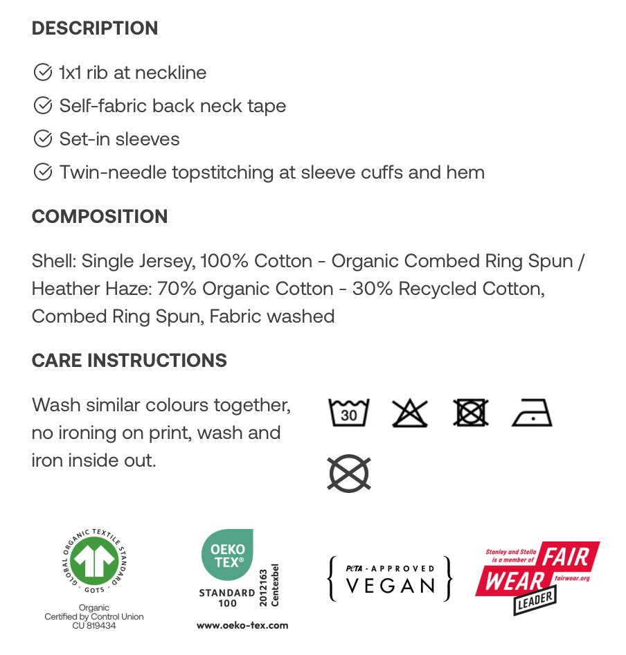 Paita valmistettu Bangladeshissä ja printataan Suomessa. Hoito-ohjeet ja kokotaulukko tuotekuvissa.