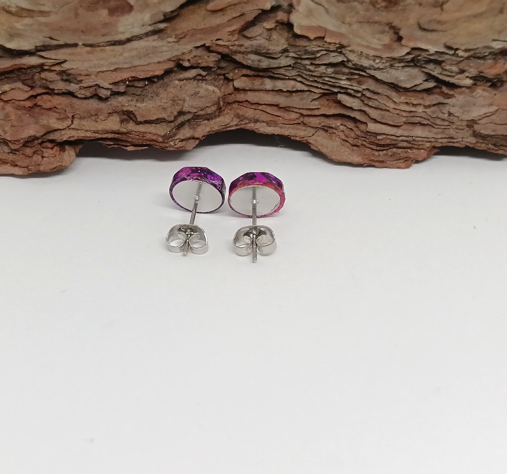 Käsintehdyt nappikorvakorut, joissa violetin ja fuksian hehku kohtaavat kimaltelevan pinnan. Glamberry yhdistää marjaisen sävykkyyden ja ripauksen glamouria – täydellinen valinta, kun haluat tuoda asuusi rohkeaa väriä ja säihkettä. Valmistettu UV-hartsista. Napin halkaisija on 8 mm ja tapit ovat ruostumatonta terästä.