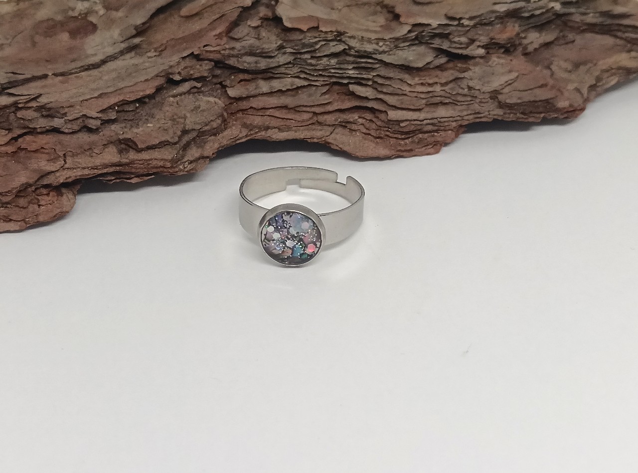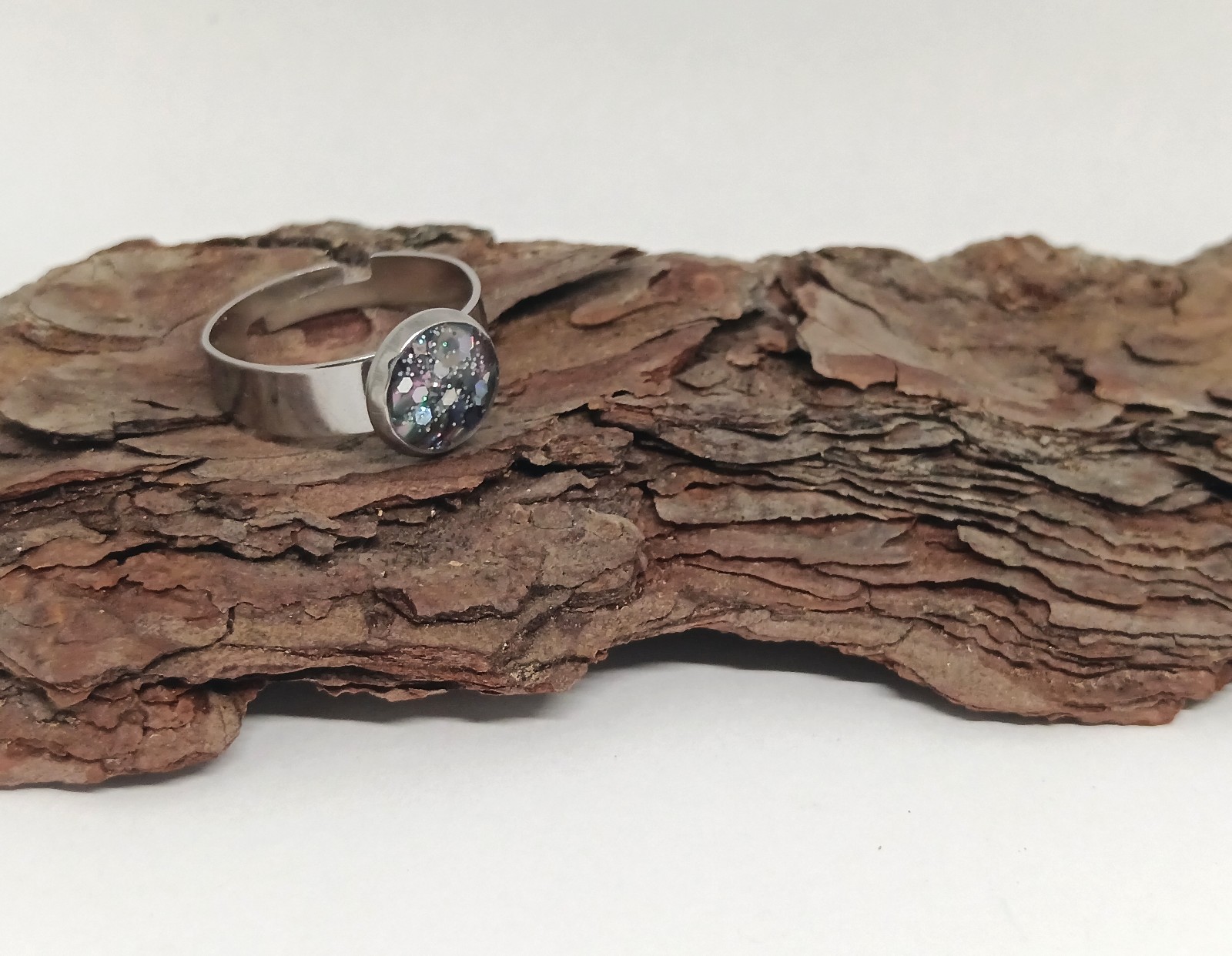 Upeasti välkehtivä terässormus, joka loistaa eri valossa eri tavoin. Sormus on säädettävissä moneen kokoon. Sormus on ruostumatonta terästä.