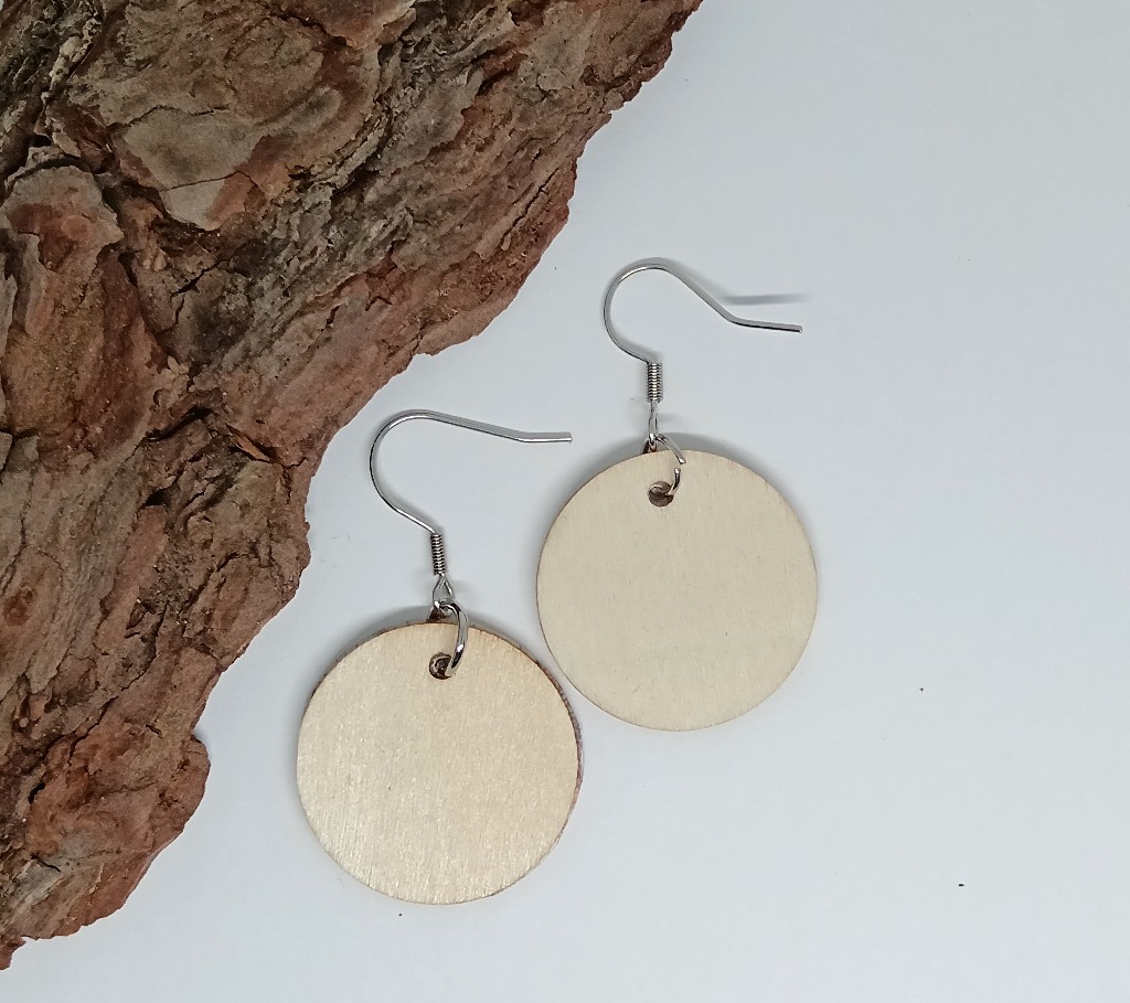 Korun tiedot: Riipus on puuta, metalliosat ovat ruostumatonta terästä. Riipuksen halkaisija on 2,5 cm. Korviksen pituus koukun kanssa n. 4,5 cm. Korviksiin tulee mukaan silikoniset taustat. Huom! Kuva vain toisella puolella.