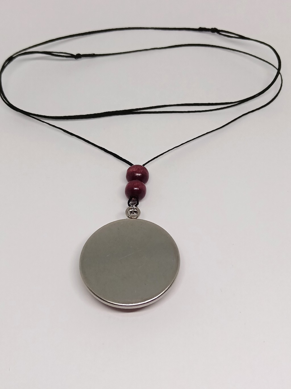 Riipuksen halkaisija on 3 cm. Korussa on puuvillanauha, jonka pituutta saa säädettyä säätösolmujen avulla. Maksimipituus on n. 68 cm. Korunosat ovat ruostumatonta terästä