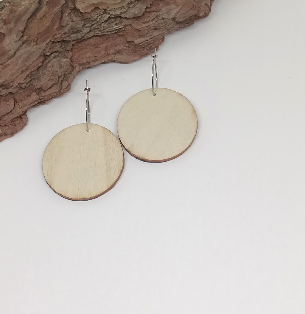 Korun tiedot: Riipus on puuta, korvisrenkaat ovat ruostumatonta terästä. Riipuksen halkaisija on 3 cm. Huom! Kuva vain toisella puolella.
