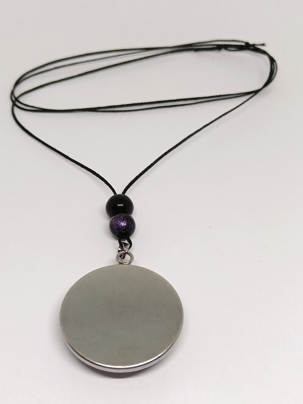 Riipuksen halkaisija on 3 cm. Korussa on puuvillanauha, jonka pituutta saa säädettyä säätösolmujen avulla. Maksimipituus on n. 68 cm. Korunosat ovat ruostumatonta terästä