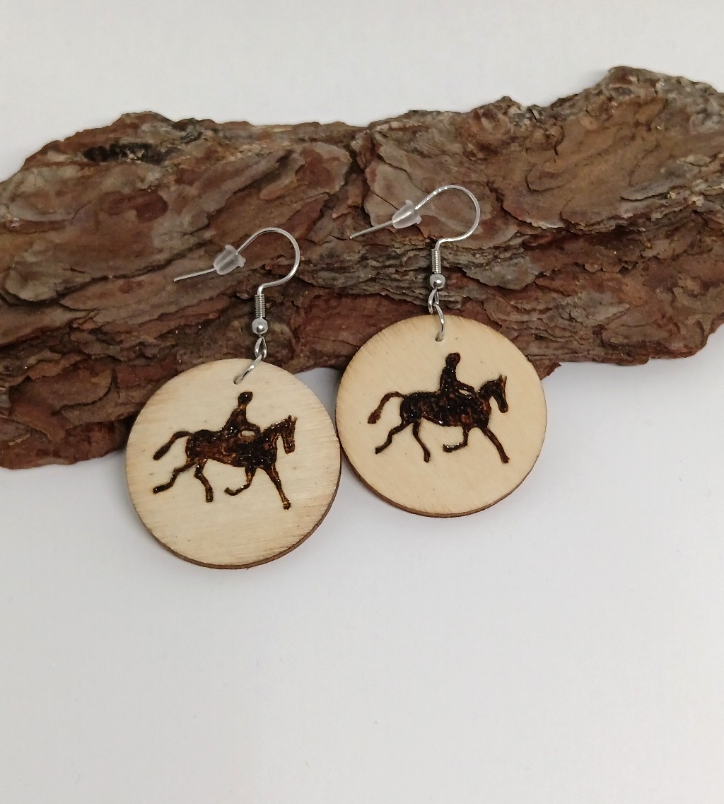 Hevosystävien korvakorut. Puuhun poltettu hevosen ja ratsastajan siluetti tekee näistä korviksista ajattomat ja persoonalliset.