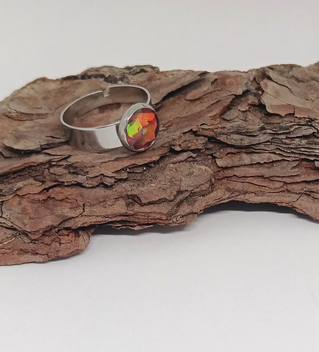 Upeasti välkehtivä terässormus, joka loistaa eri valossa eri tavoin. Sormus on säädettävissä moneen kokoon. Sormus on ruostumatonta terästä.