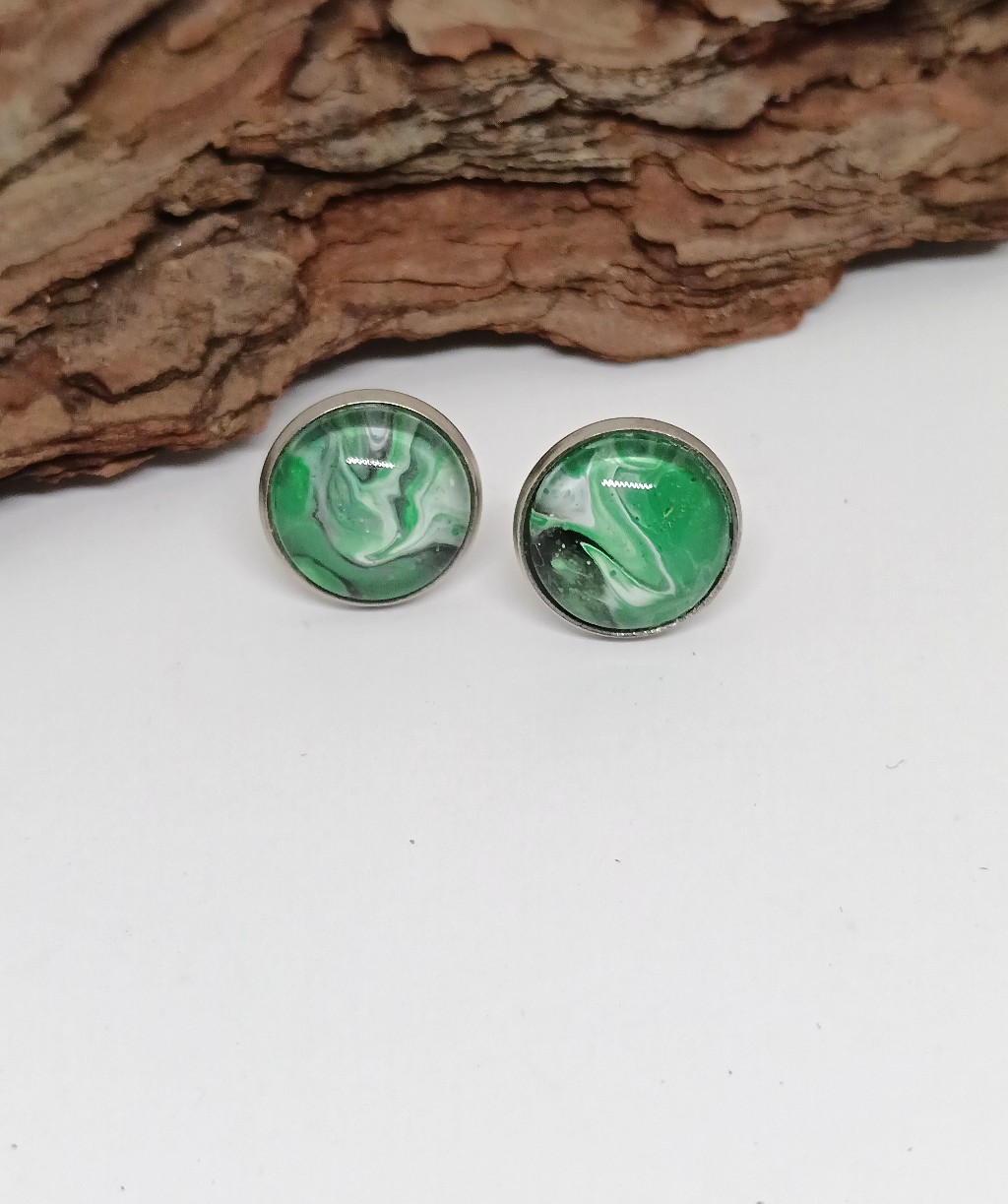 Sammal on nappikorvakoru, jossa tummanvihreä, valkoinen ja musta sulautuvat abstraktiksi fluid art -kuvioksi. Luonnon rauhasta inspiroitunut pinta tekee korusta ainutlaatuisen ja ajattoman.