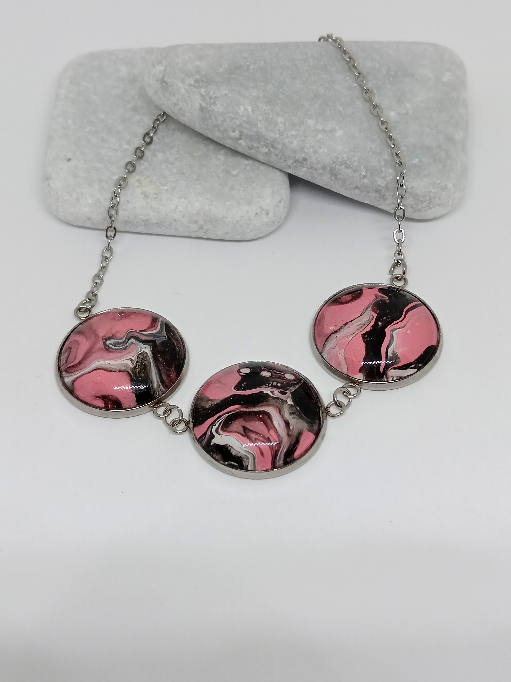 Abstrakti kaulakoru vaaleanpunaisen ja mustan sävyissä, joissa pääosassa on käsin tehty abstrakti maalaus. Tyylikäs ja moderni, täydellinen lisä arkeen tai juhlaan.