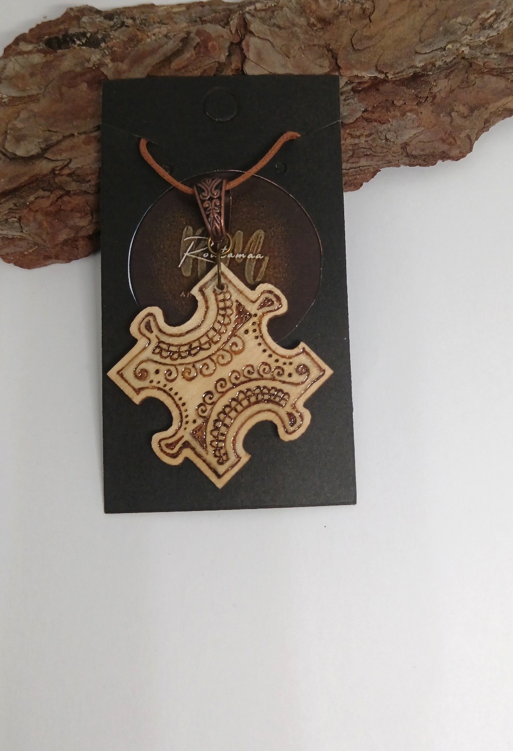 Harmony Palapelin muotoinen riipus hennamaisilla polttokuvioilla. Harmony heijastaa tasapainoa ja rauhaa – kahden elementin kaunista rinnakkaiseloa. Se on muistutus harmoniasta, joka löytyy pienistäkin yksityiskohdista.
