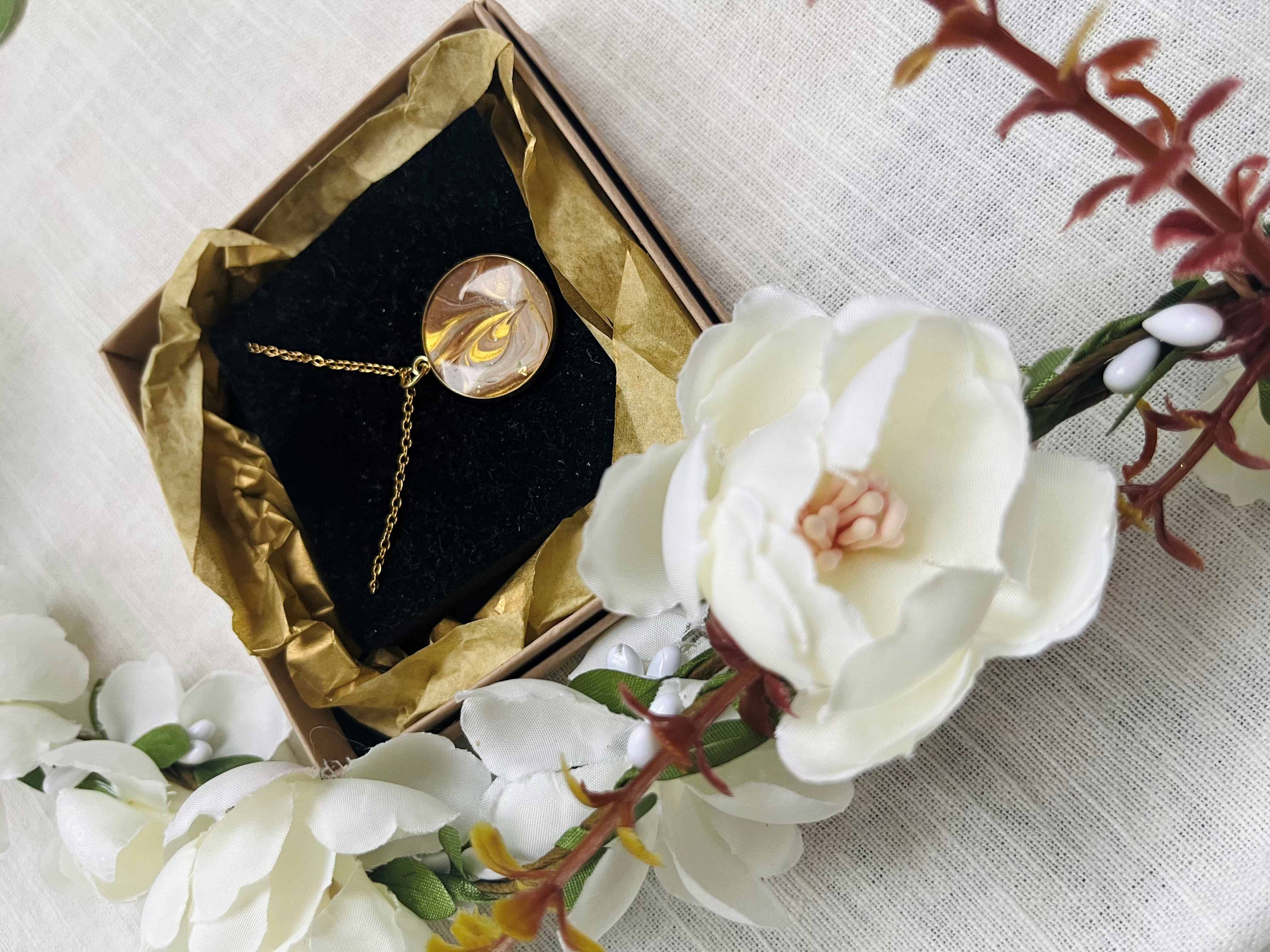 Riipus ja ketju 18K kullattua kirurginterästä. Riipuksen halkaisija 20mm, ketjun pituus 49cm. Riipuksessa pala aitoa taideteosta, jonka päällä läpikuultava lasimainen epoksi hartsi pinnoitus. Pinnoitus on kestävää materiaalia ja korun kastumista ei myöskään tarvitse välttää.