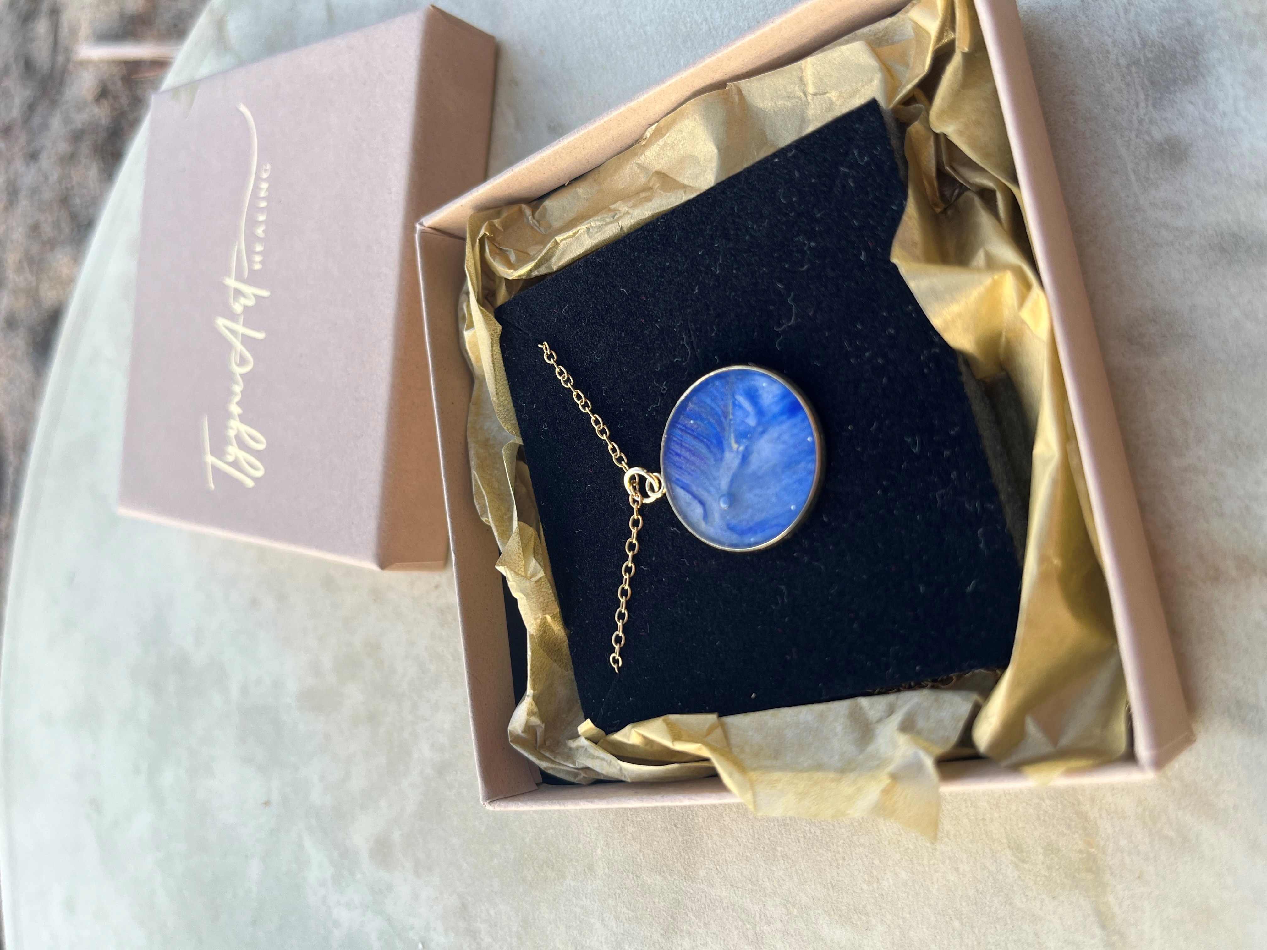 Riipuksessa pala aitoa taideteosta, jonka päällä läpikuultava epoksi hartsi pinnoitus. Pinnoitus on kestävää materiaalia ja korun kastumista ei myöskään tarvitse välttää. Pinnoitus tuo kauniisti esille taideteoksen kauniit yksityiskohdat.