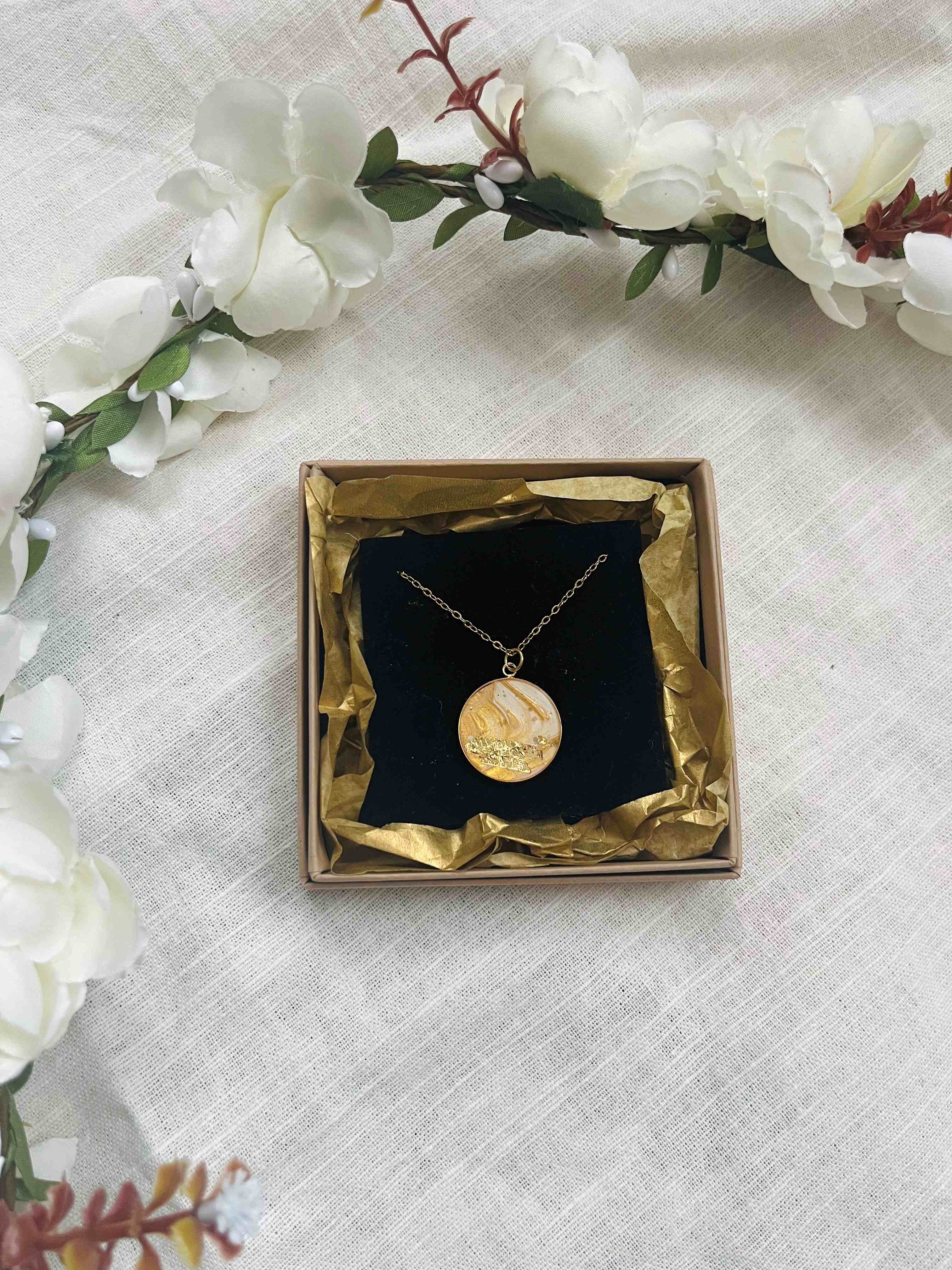Riipus ja ketju 18K kullattua kirurginterästä. Riipuksen halkaisija 20mm, ketjun pituus 49cm. Riipuksessa pala aitoa taideteosta, jonka päällä läpikuultava lasimainen epoksi hartsi pinnoitus. Pinnoitus on kestävää materiaalia ja korun kastumista ei myöskään tarvitse välttää.