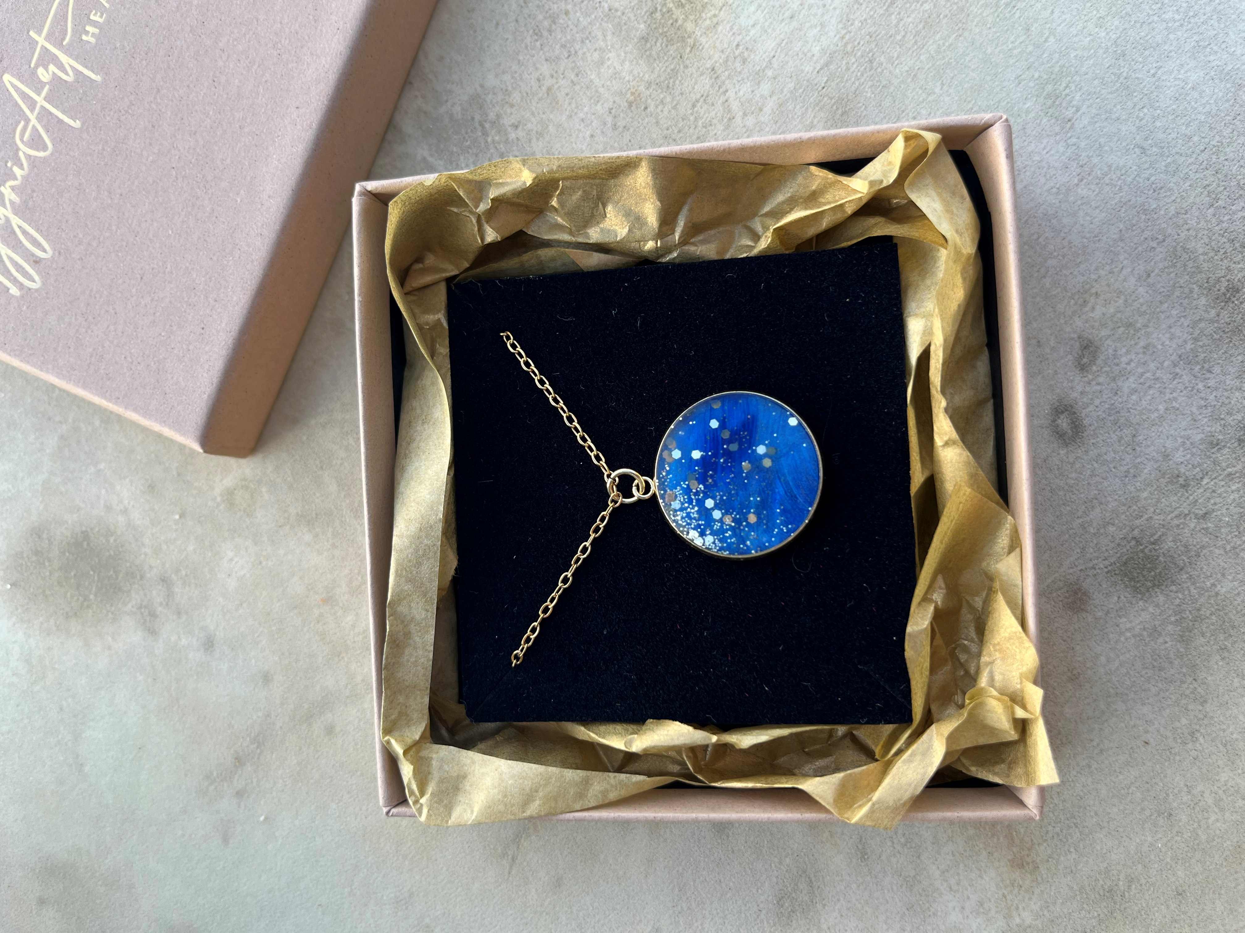 Riipus ja ketju 18K kullattua kirurginterästä. Riipuksen halkaisija 20mm, ketjun pituus 49cm. Riipuksessa pala aitoa taideteosta, jonka päällä läpikuultava lasimainen epoksi hartsi pinnoitus.