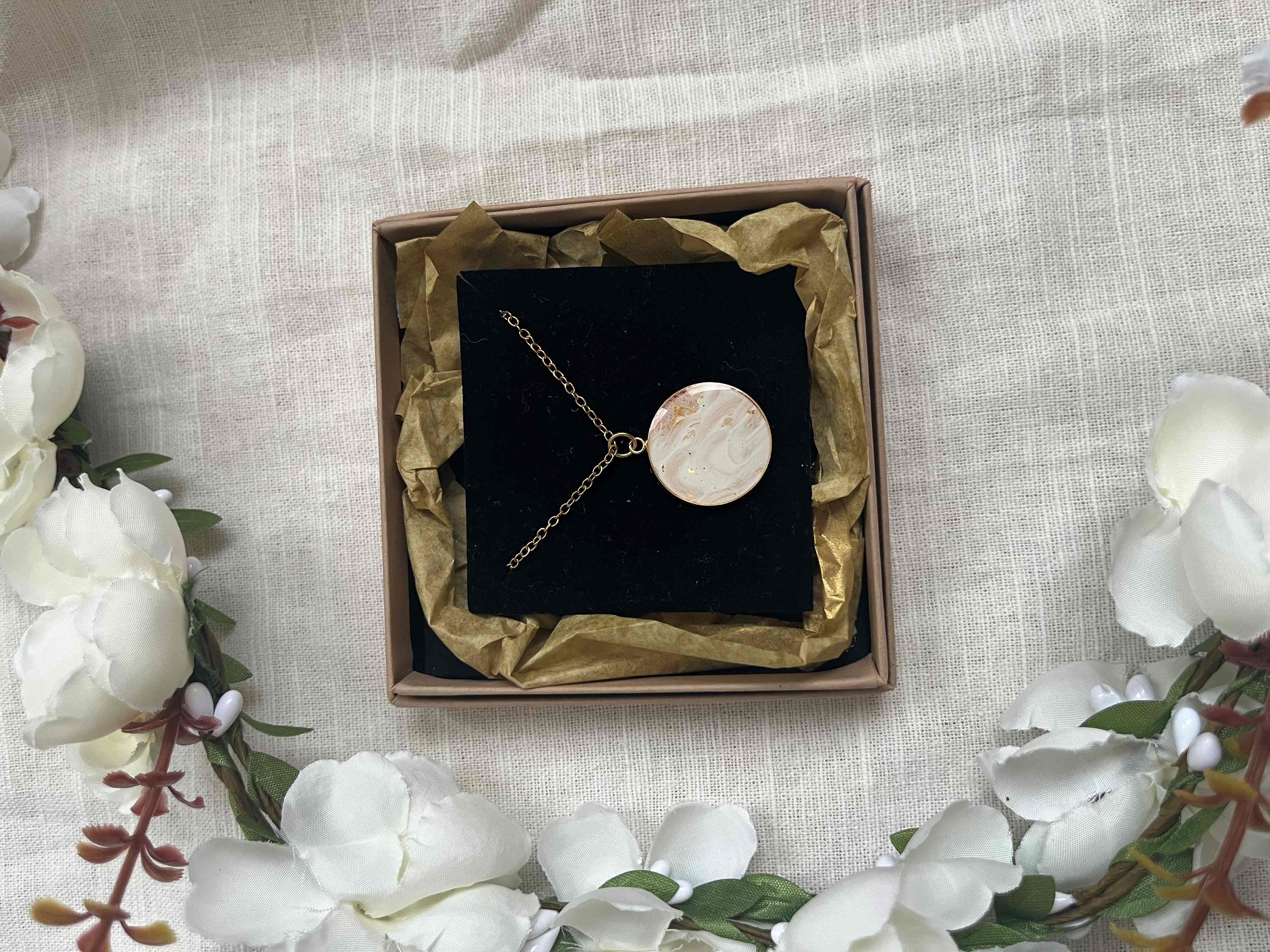 Riipus ja ketju 18K kullattua kirurginterästä. Riipuksen halkaisija 20mm, ketjun pituus 49cm. Riipuksessa pala aitoa taideteosta, jonka päällä läpikuultava lasimainen epoksi hartsi pinnoitus. Pinnoitus on kestävää materiaalia ja korun kastumista ei myöskään tarvitse välttää.