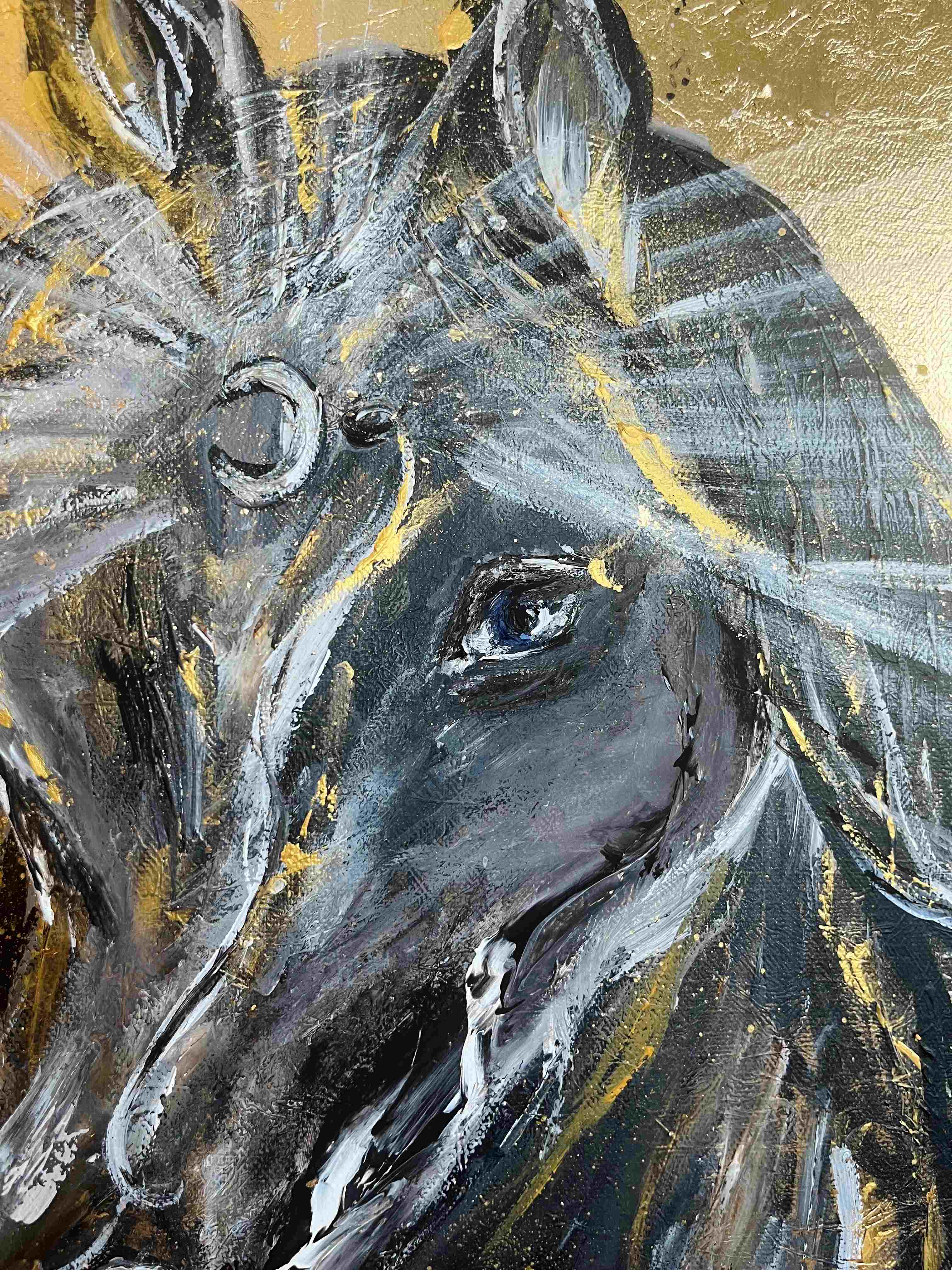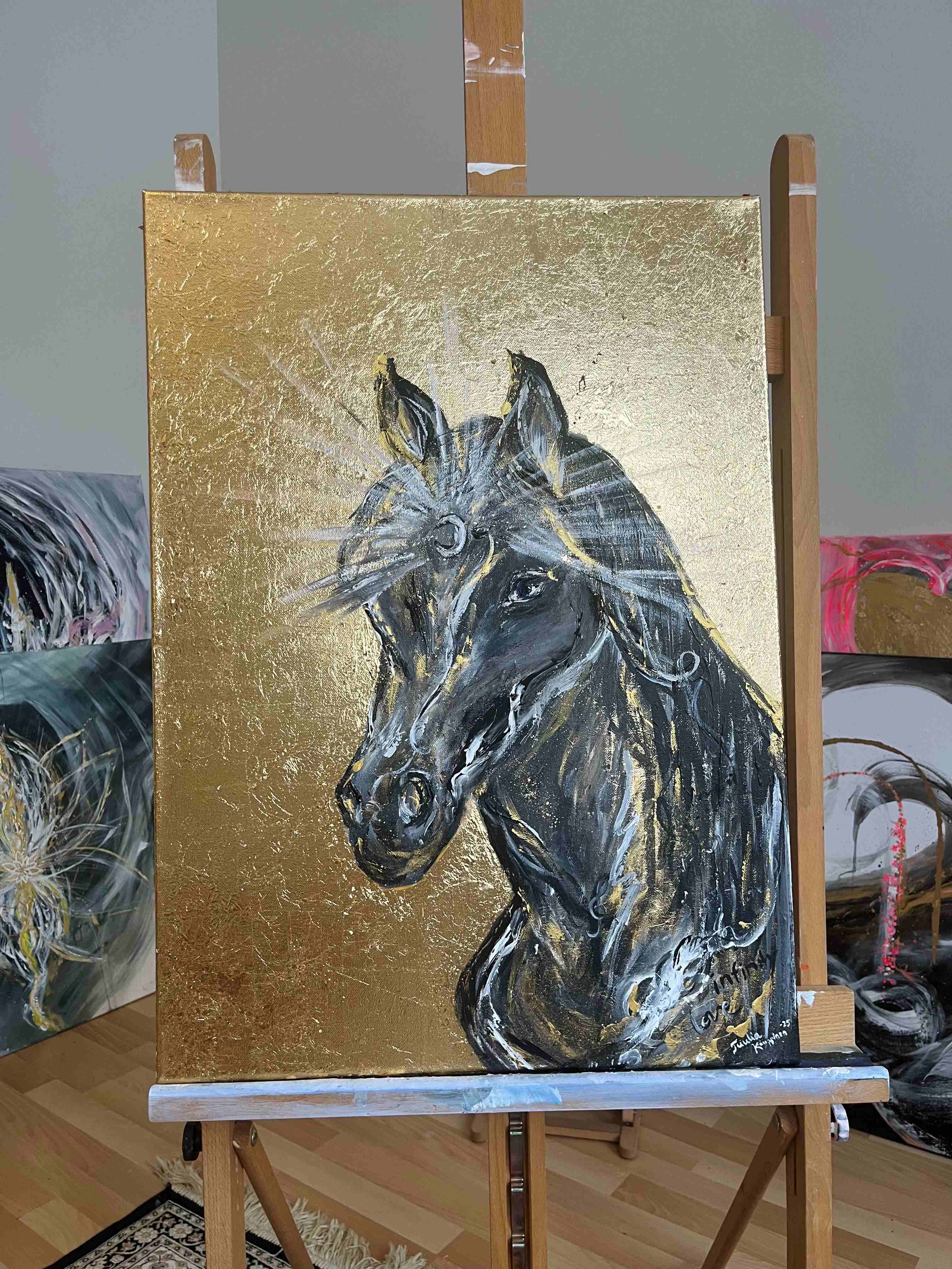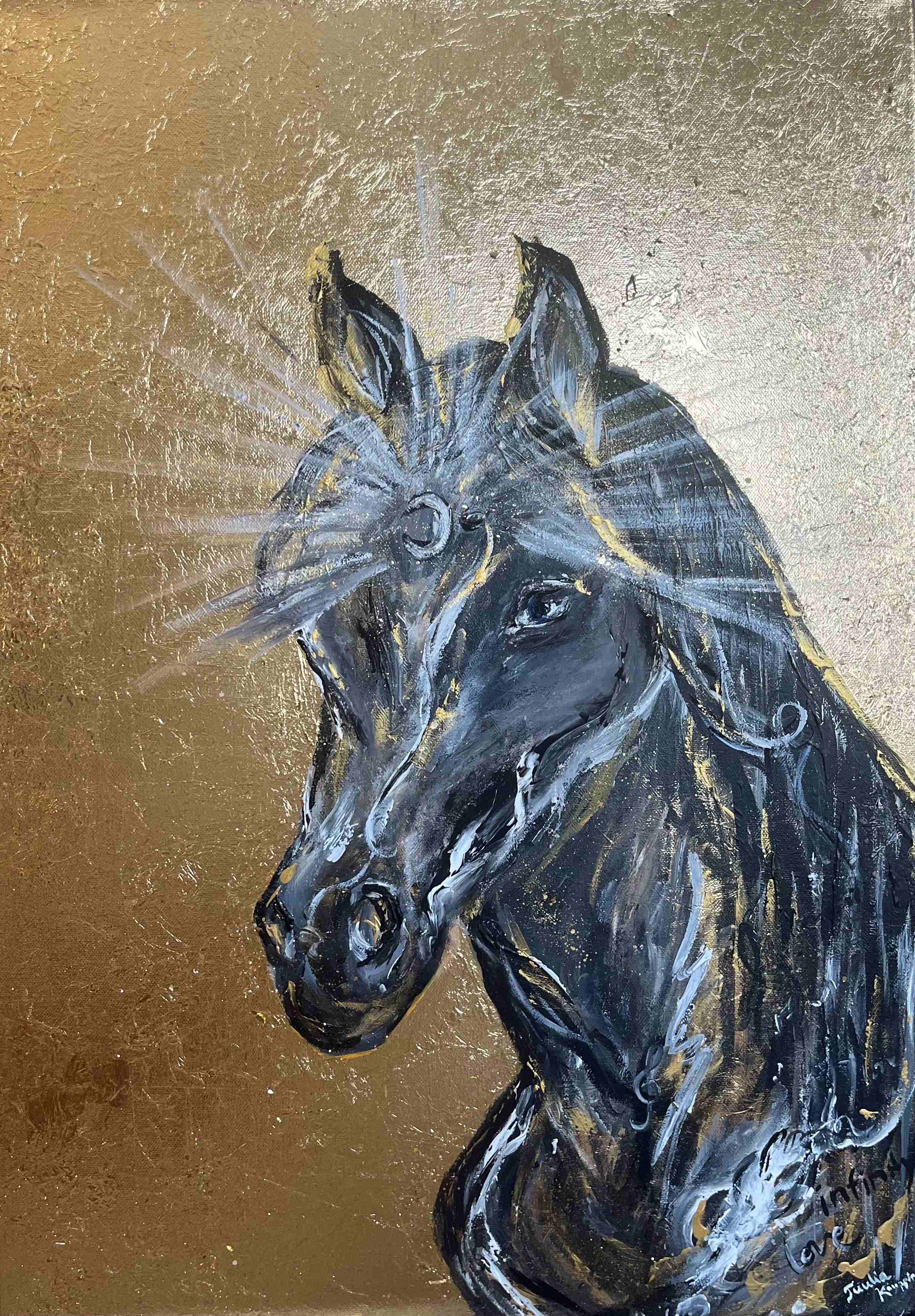 Teoksessa on käytetty lehtikultaa, joka tuo teokseen syvän tunteen arvokkuudesta ja äärettömästä valosta. Teoksen hevonen katsoo sinisillä silmillään rauhallisesti kohti tulevaisuutta, kuitenkin syvästi ankkuroituneena tähän hetkeen.