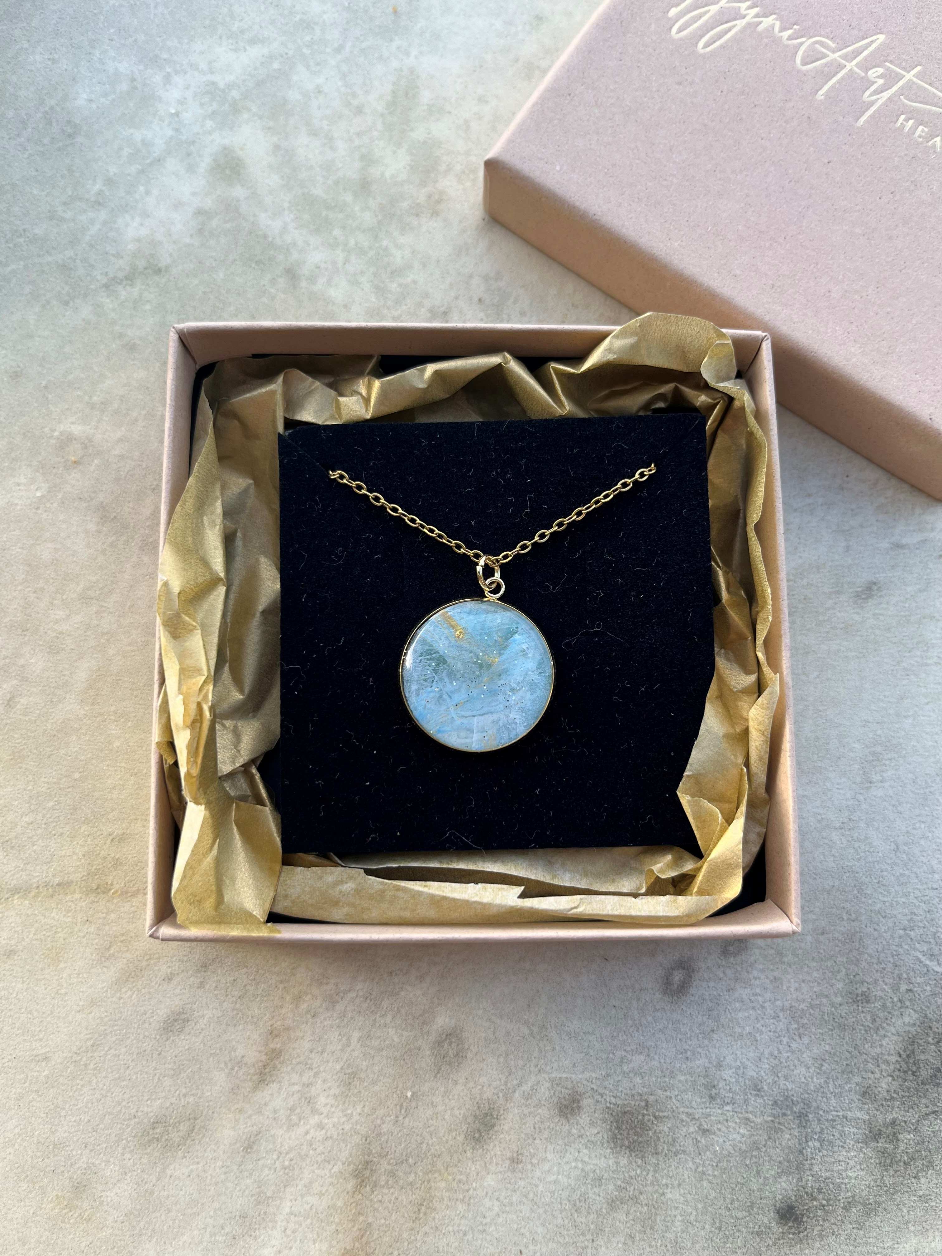 Riipus ja ketju 18K kullattua kirurginterästä. Riipuksen halkaisija 20mm, ketjun pituus 49cm. Riipuksessa pala aitoa taideteosta, jonka päällä läpikuultava lasimainen epoksi hartsi pinnoitus. Pinnoitus on kestävää materiaalia ja korun kastumista ei myöskään tarvitse välttää.
