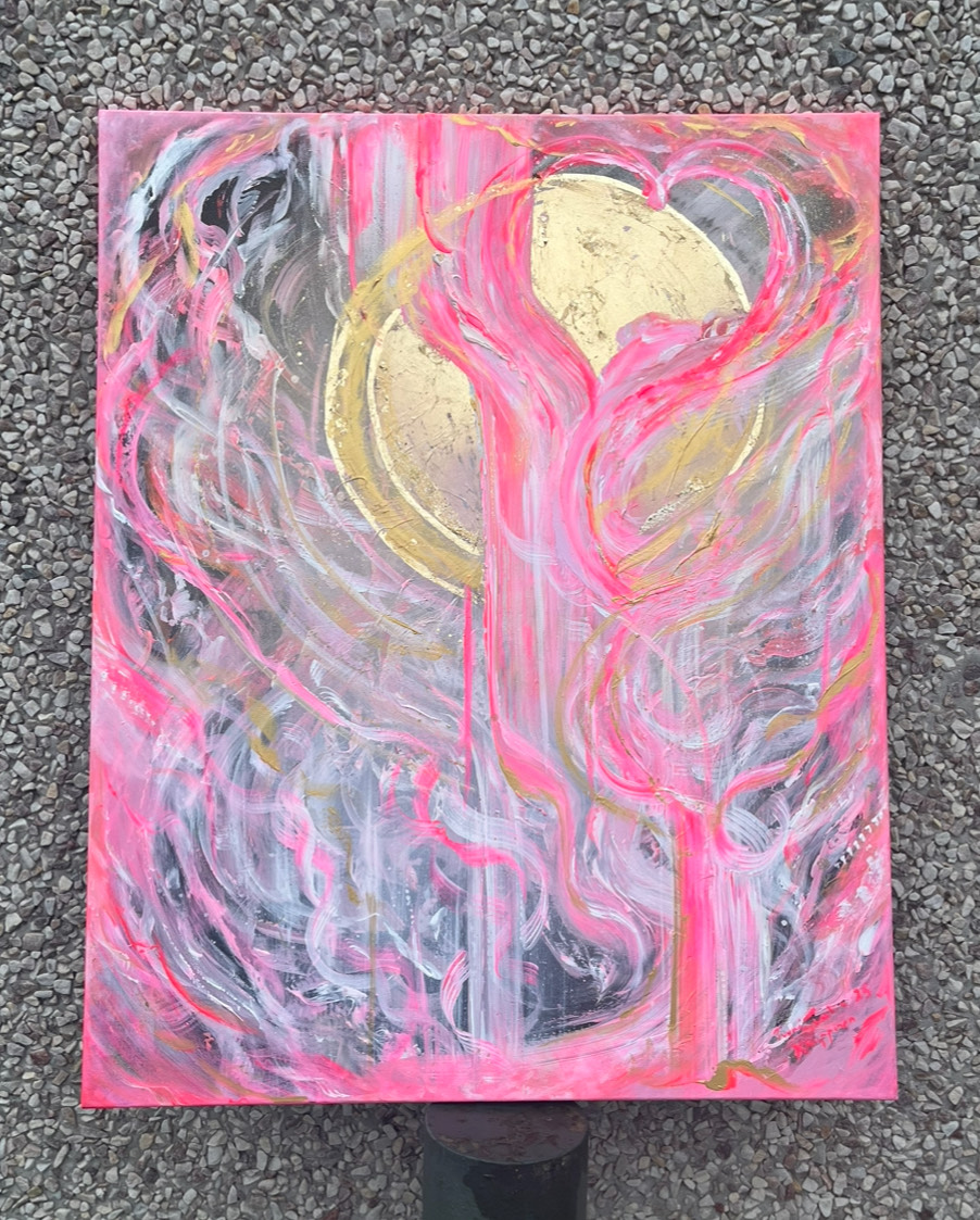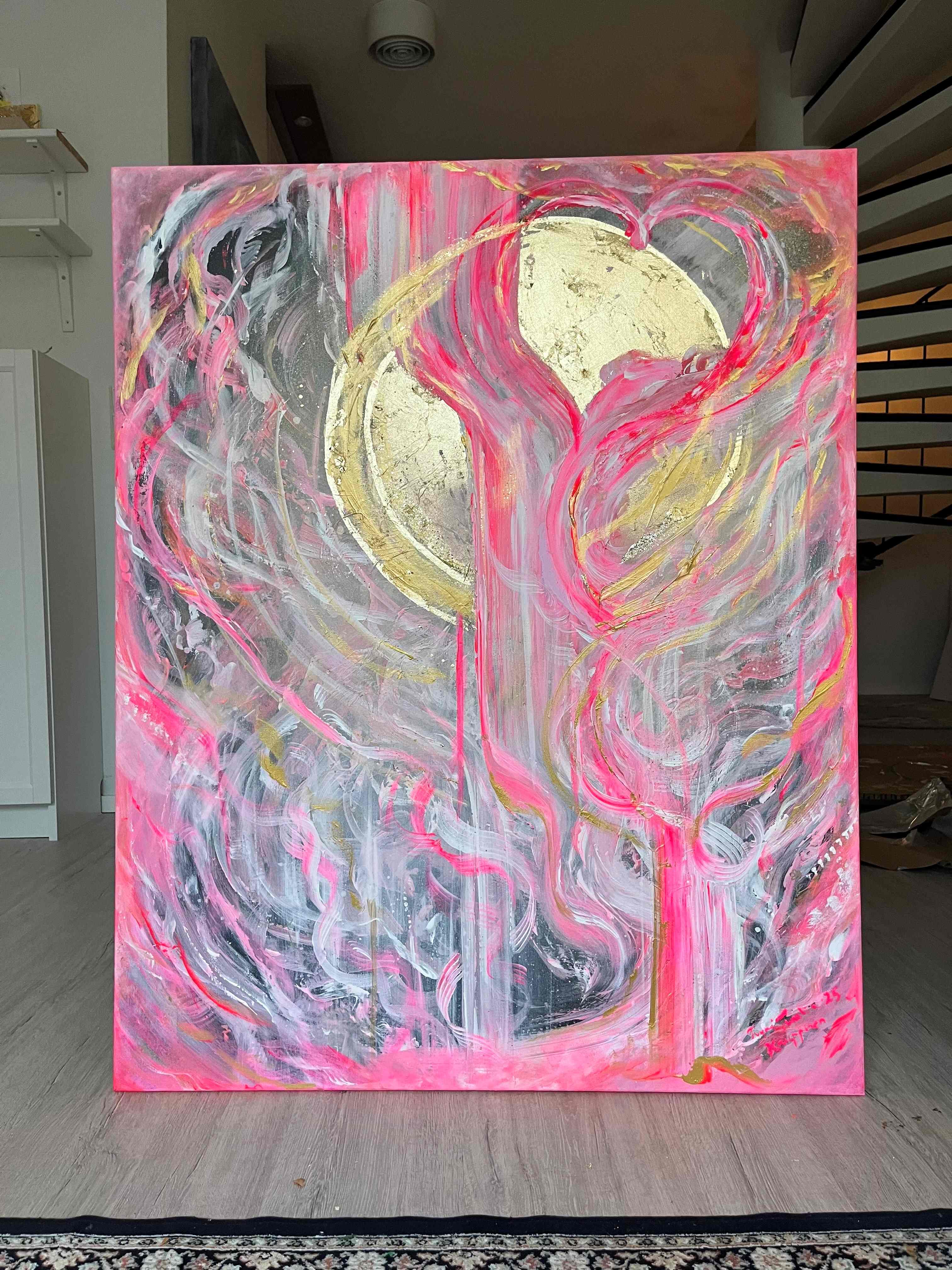 Time to Celebrate on 100x80 cm kokoinen akryylimaalaus canvas-pohjalle. Teoksessa yhdistyvät akryylivärien kerroksellinen syvyys, lehtikullan hohto ja sprayn ilmava rosoisuus. Lopputulos on lämmin, voimakas ja juhlistava – kuin valon hetki, joka on pysähtynyt kankaalle.