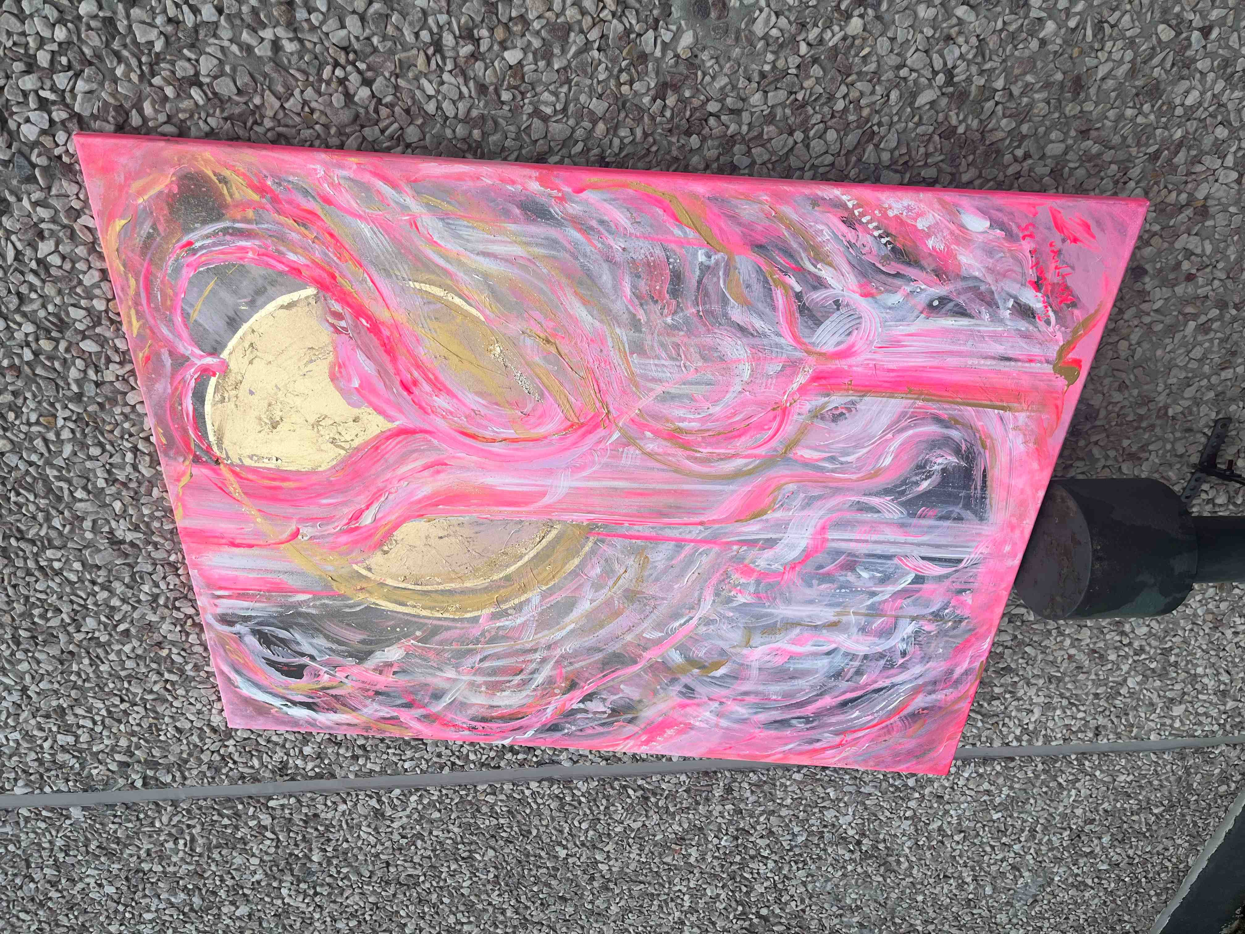 Koko: 100 x 80 cm Tekniikka: akryyli, lehtikulta, spray maalattu canvasille