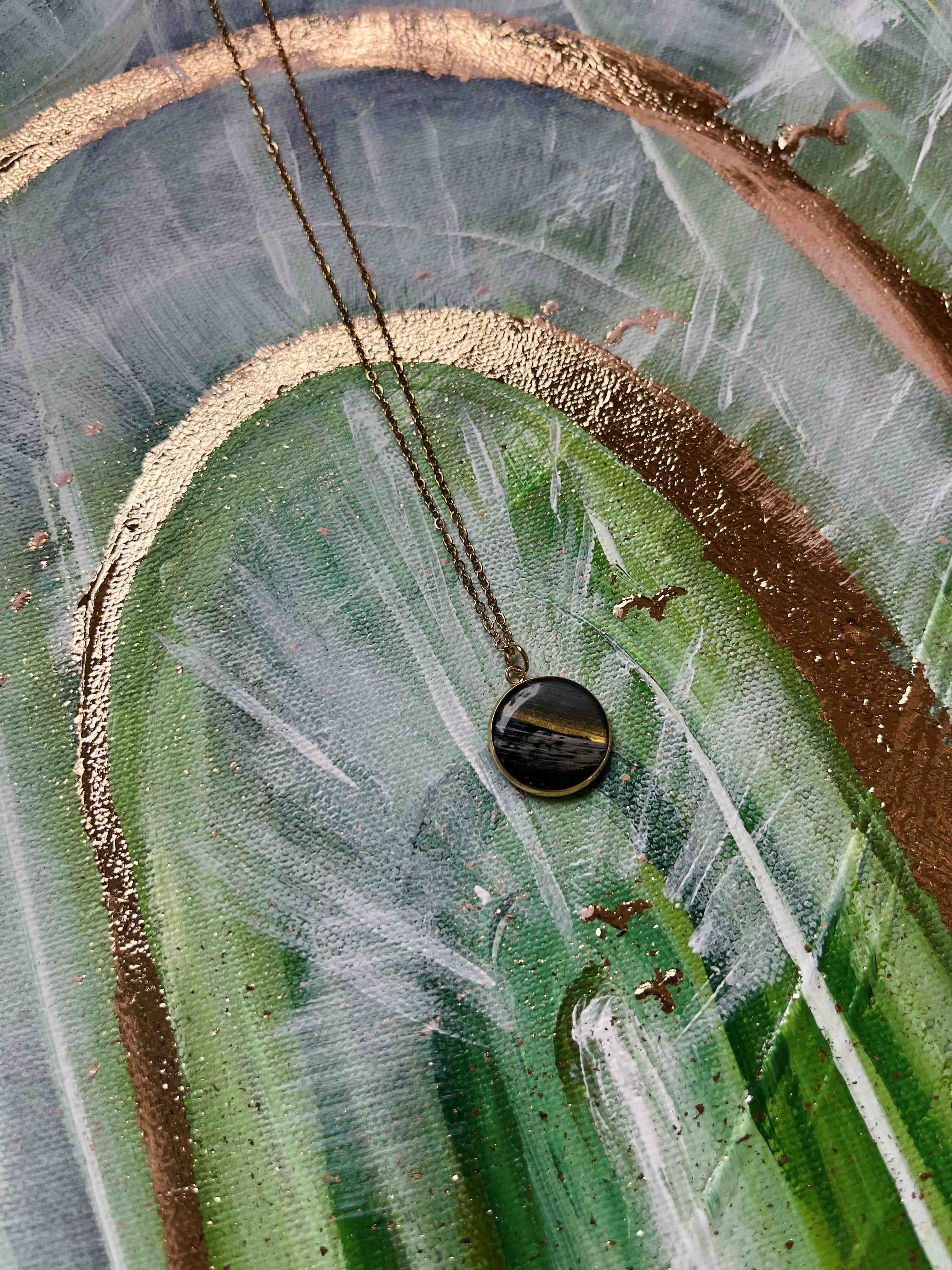Riipus ja ketju 18K kullattua kirurginterästä. Riipuksen halkaisija 16mm, ketjun pituus 49cm. Riipuksessa pala aitoa taideteosta, jonka päällä läpikuultava lasimainen epoksi hartsi pinnoitus.