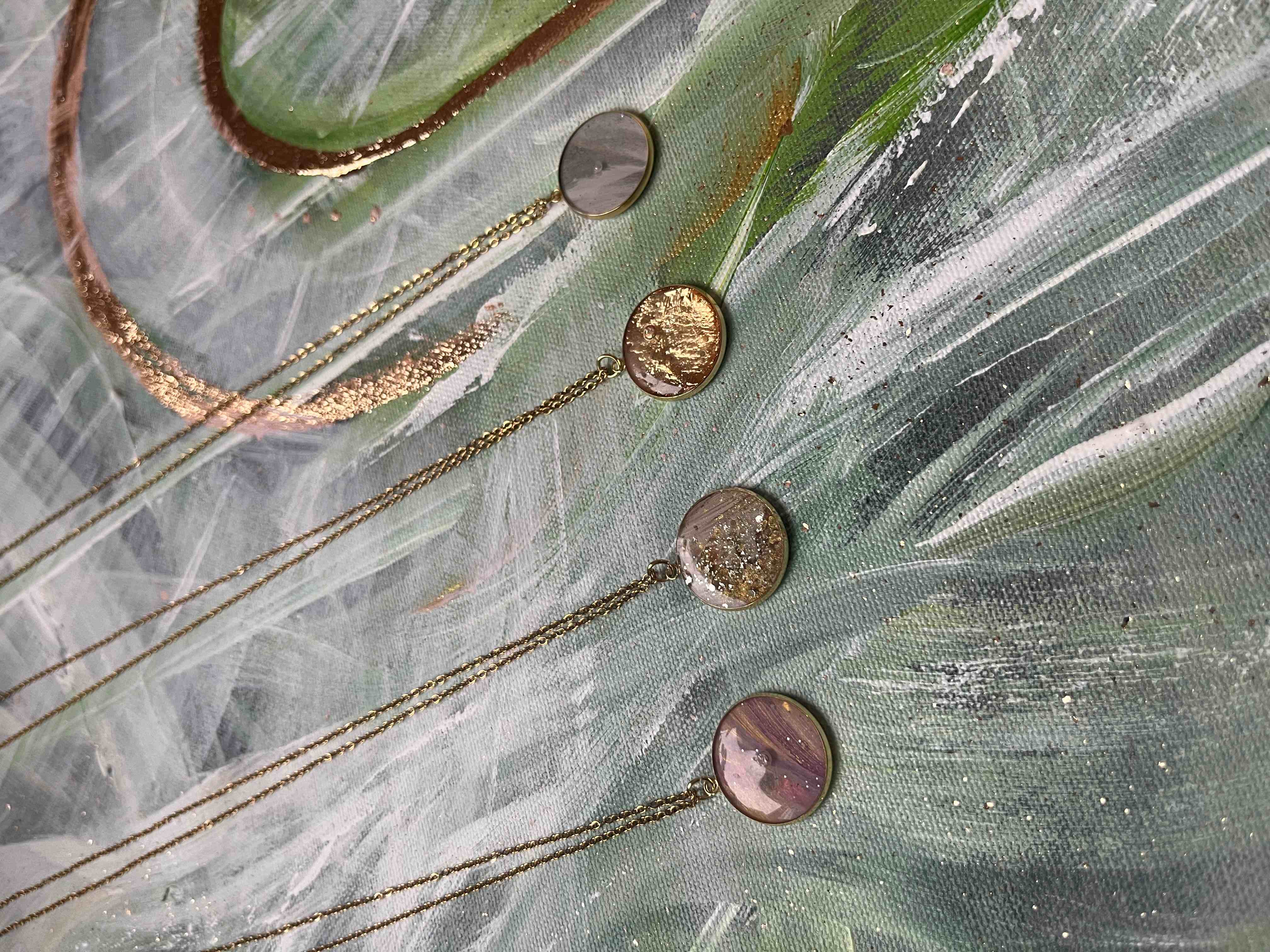 Riipus ja ketju 18K kullattua kirurginterästä. Riipuksen halkaisija 20mm, ketjun pituus 49cm. Riipuksessa pala aitoa taideteosta, jonka päällä läpikuultava lasimainen epoksi hartsi pinnoitus.