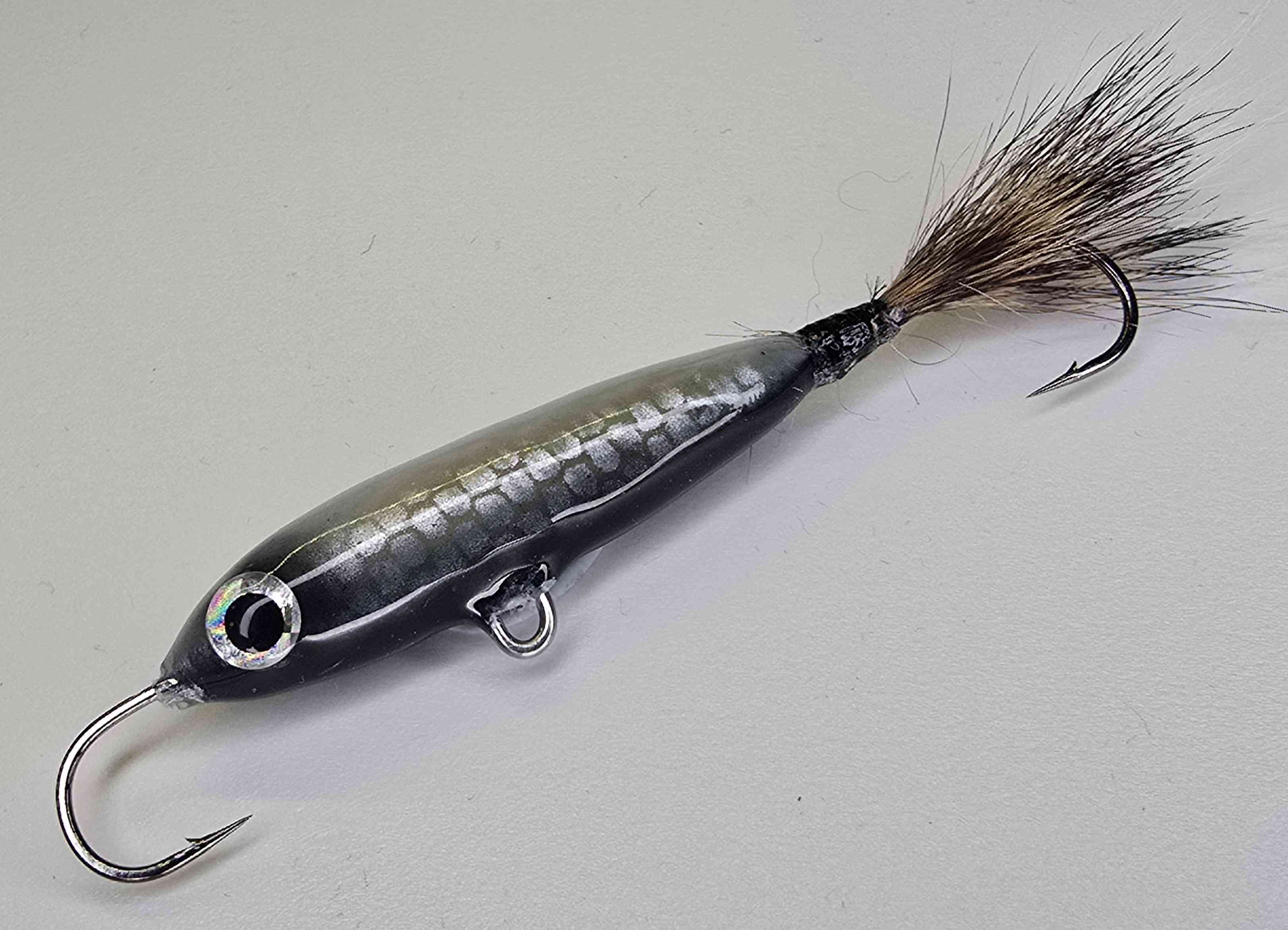 70mm pitkä (koukun mutkasta mutkaan) ja 9 g painoinen karvapyrstöinen tasapainopilkki. Runko tehty sinkistä, eli ei sisällä lyijyä. Suunniteltu ahvenen pilkintään mutta toimii myös muille kaloille.