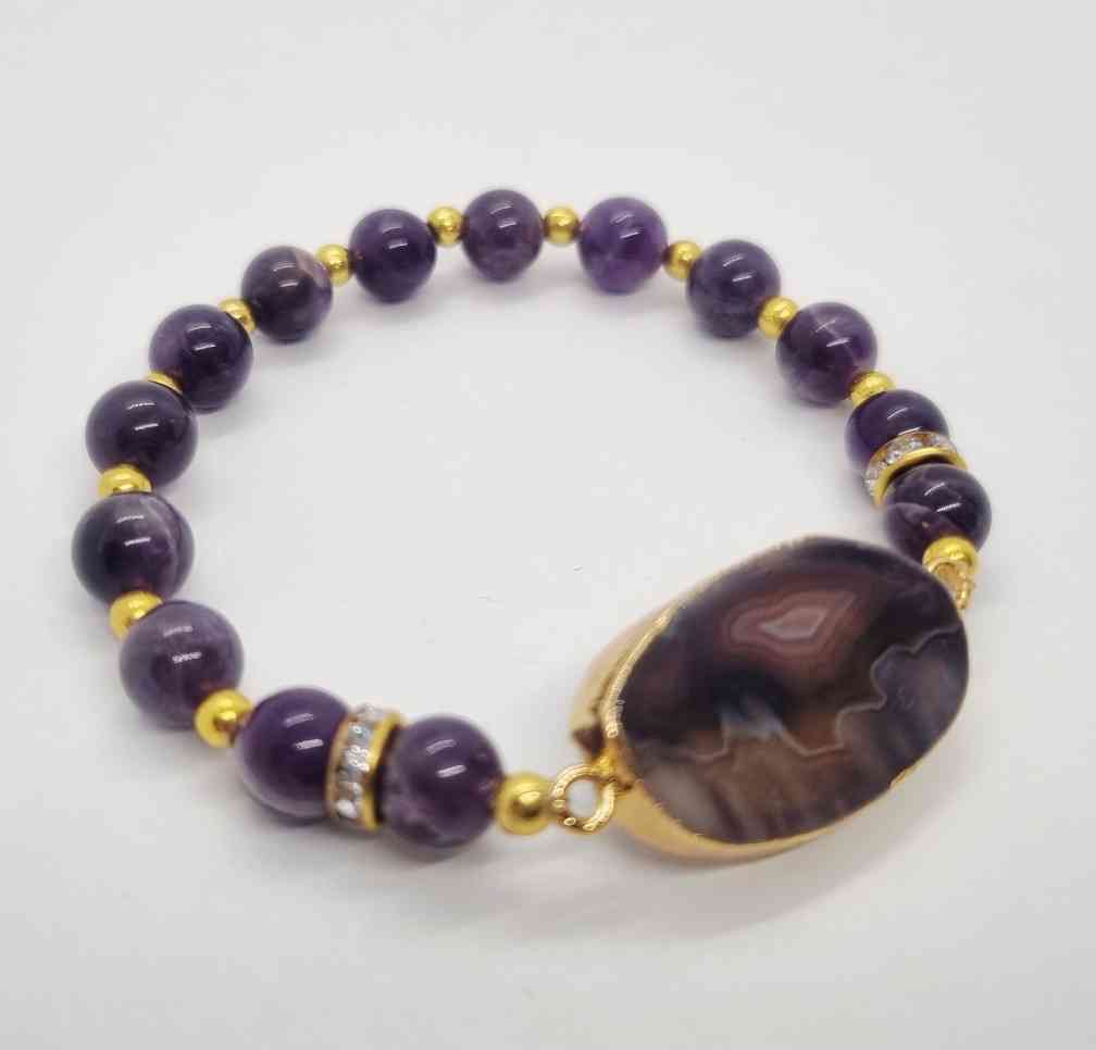 Korun materiaali: Ametisti, Raita-akaatti druzy levy, akryyli tai muovi, korumetalli, kuminauha
