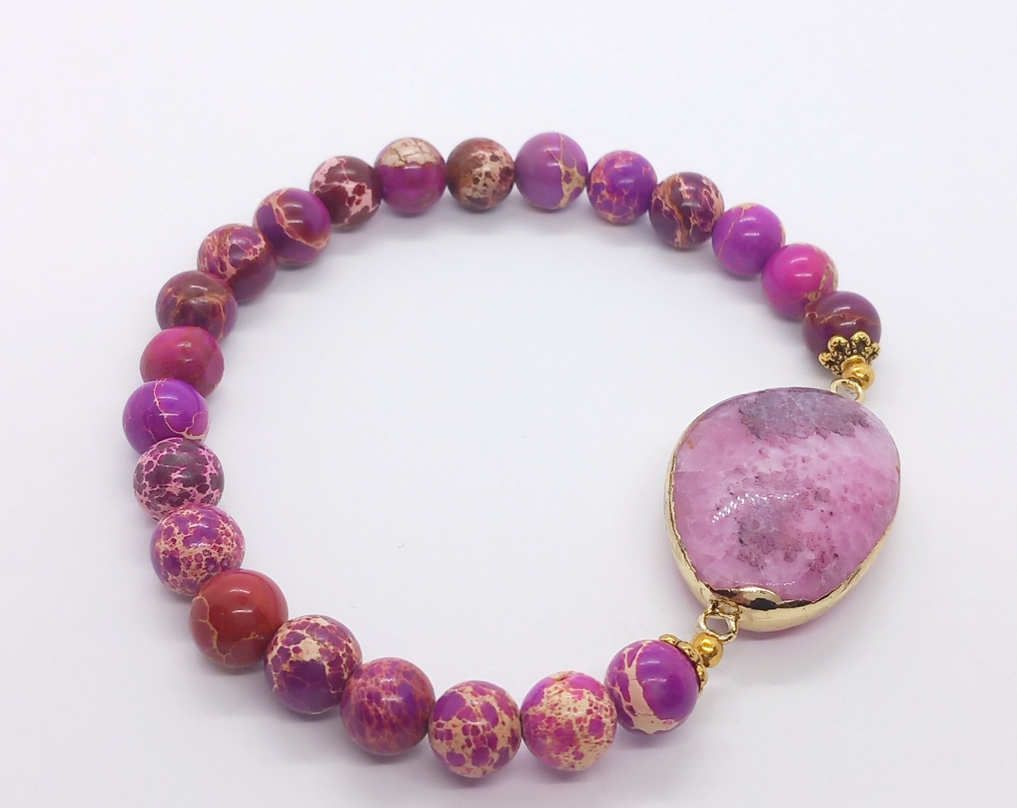 Käsintehty purppuranpunainen Imperial Jasper -rannekorumme voi tuoda mukanaan sekä itseluottamusta että syvästi juurtunutta rauhaa.