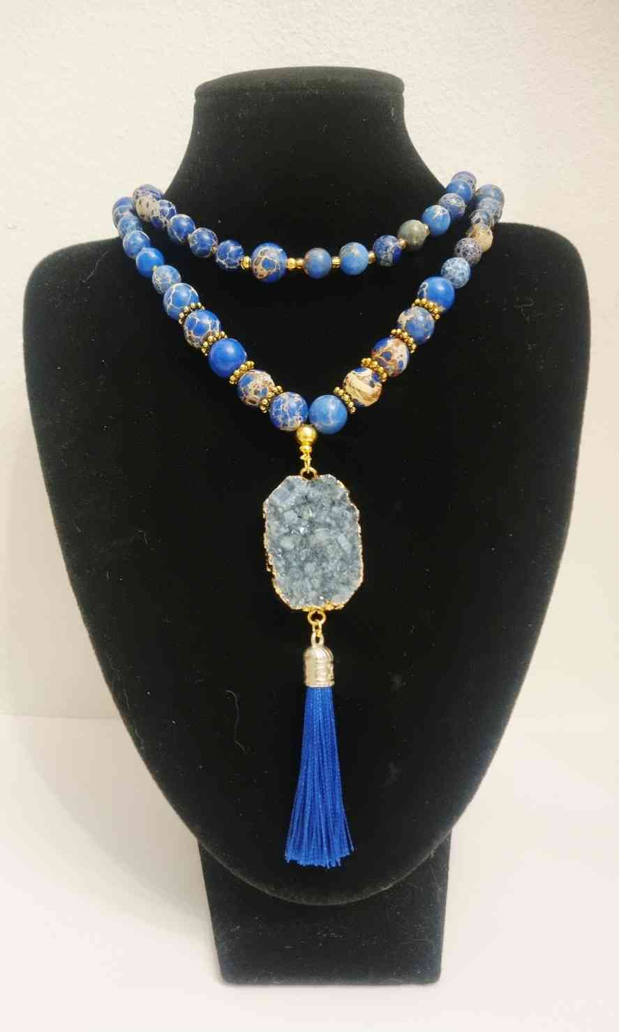 Materiaali: synt.- ja/tai kivihelmet 6-10mm, akaatti druzylevy, korumetalli, metallilanka, polyesteritasseli