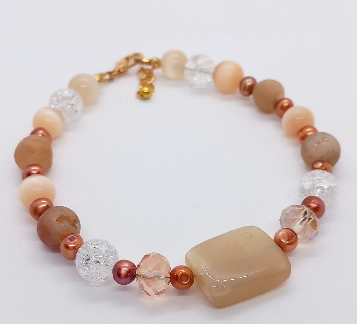 Säädettävä, Beige Kuukivi, kissansilmä-, akaattihelmet 6-8mm, akryylihelmet, metallilanka, korumetalli