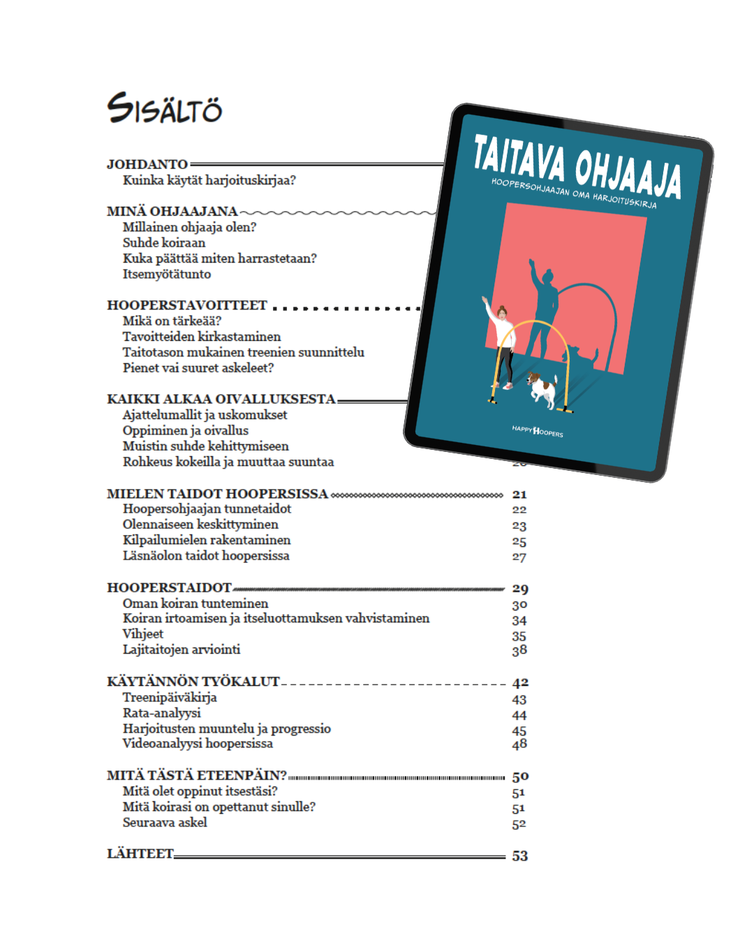 Tämä sähköinen harjoituskirja tukee sinua kehittymään hoopersohjaajana tietoisesti ja suunnitelmallisesti. Se auttaa jäsentämään omaa toimintaasi, havainnoimaan koiraasi sekä suuntaamaan treenejä kohti teille merkityksellisiä tavoitteita.
