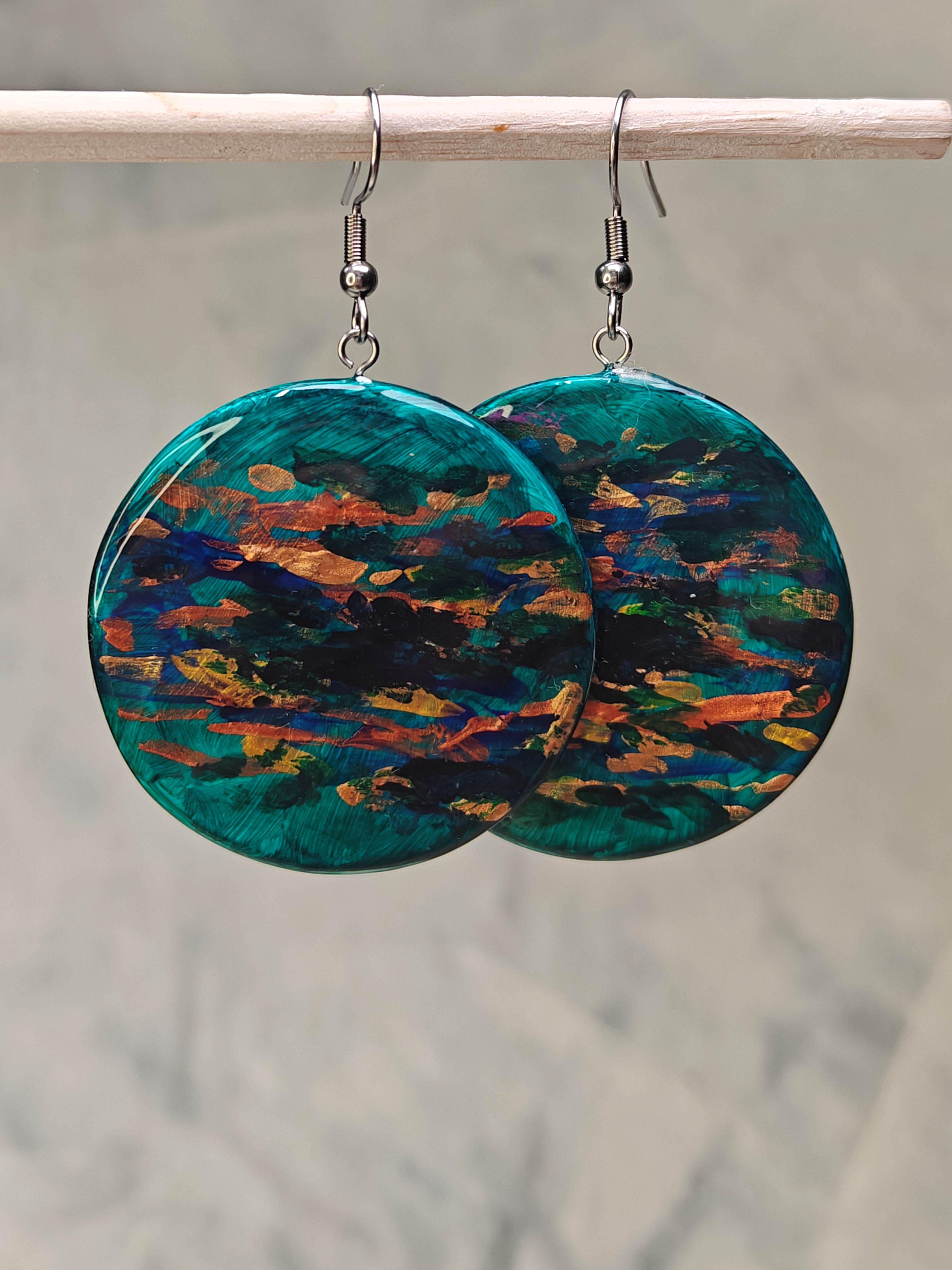 Kauniit käsintehdyt ja käsinmaalatut korvikset. Materiaali massaa, joka on kauttaaltaan pinnoitettu koruhartsilla. Koruosan halkaisija 4 cm. Uniikit ja numeroidut. Yhden korun paino noin 4 g.