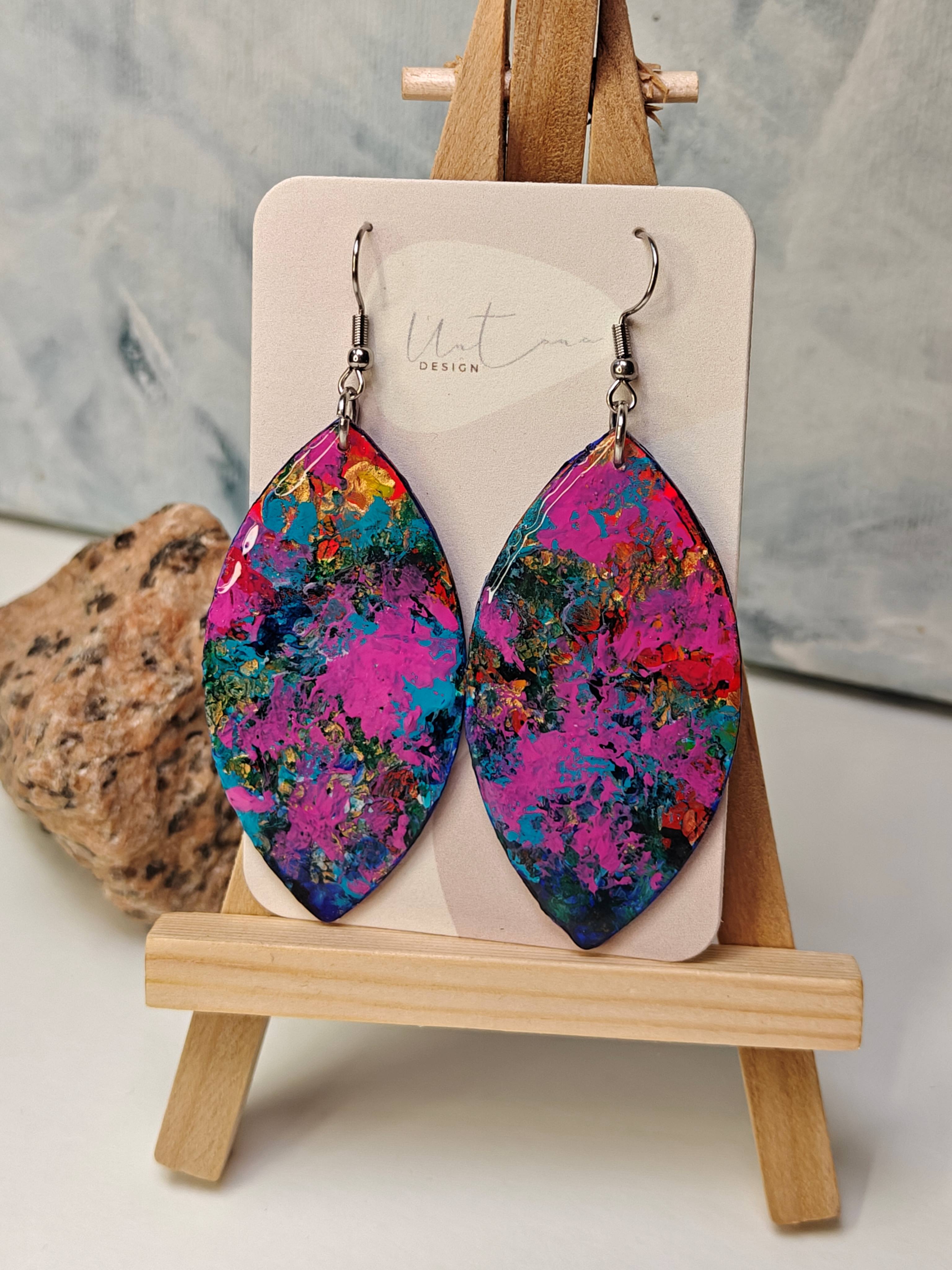 Kauniit käsintehdyt ja käsinmaalatut korvikset. Materiaali massaa, joka on pinnoitettu koruhartsilla sekä etu-, että takapuolelta. Koruosan korkeus 6 cm. Uniikki pari. Yhden korun paino noin 4 g.