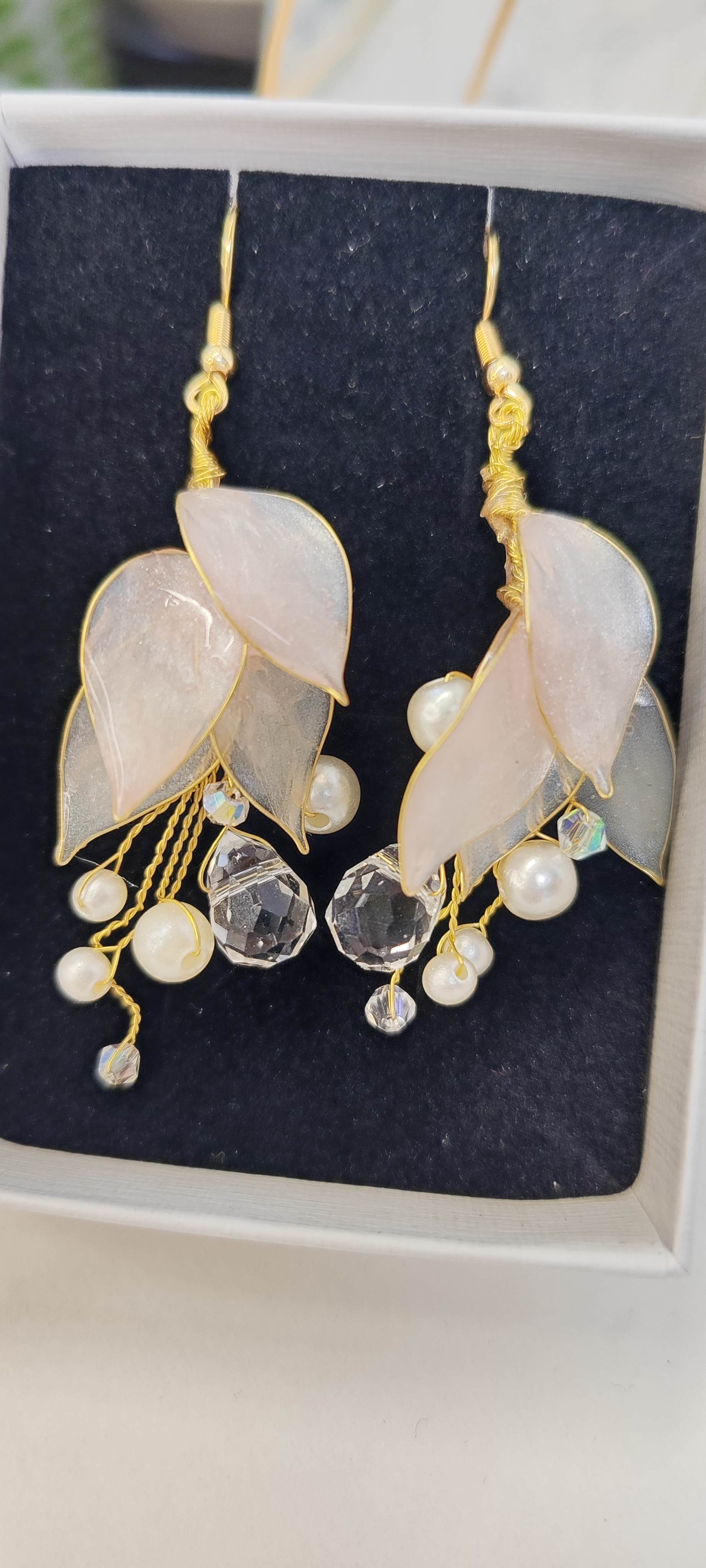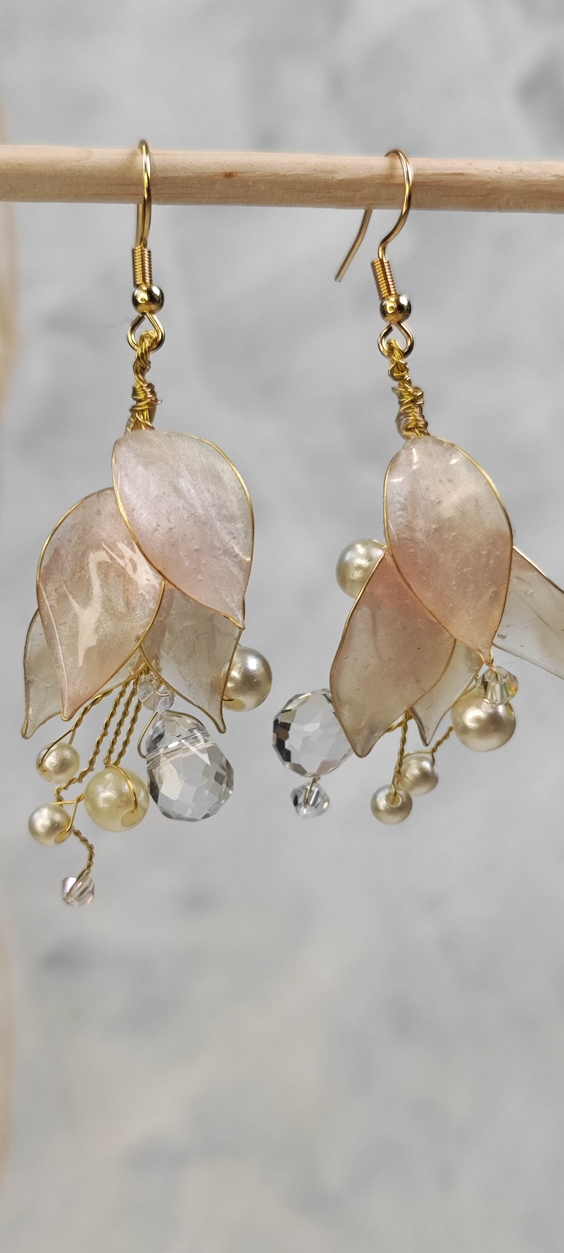 Kauniit dippaustekniikalla käsintehdyt korvakorut. Materiaali koruhartsia ja metallilankaa. Helmet yms lasia/muovia. Korun korkeus koukkuineen n. 7 cm. Koukut kirurginterästä tai kullattua kirurginterästä. Yhden korun paino noin 1-3 g. Uniikki pari.