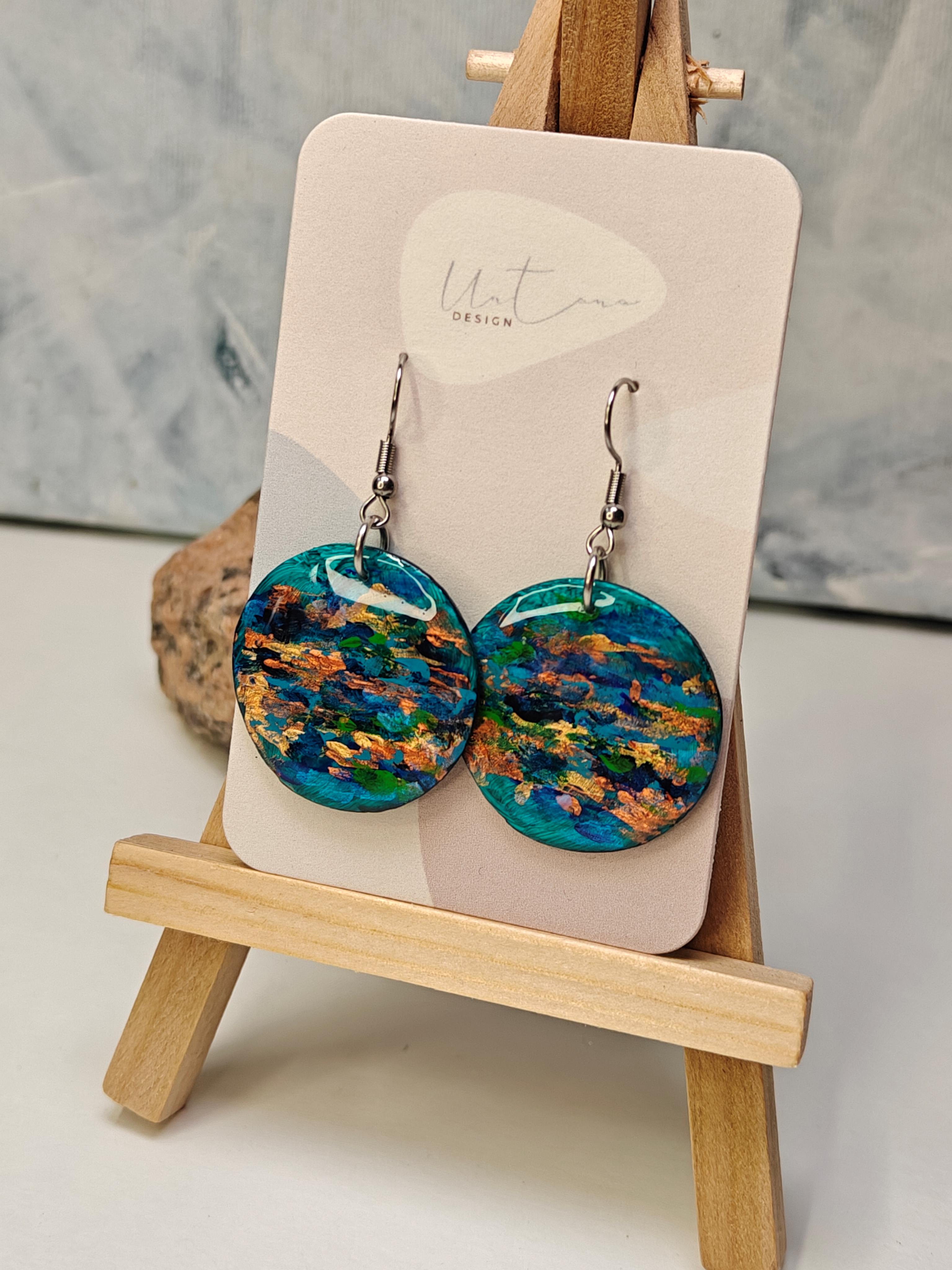 Kauniit käsintehdyt ja käsinmaalatut korvikset. Materiaali massaa, joka on pinnoitettu koruhartsilla sekä etu-, että takapuolelta. Koruosan halkaisija 3 cm. Uniikki pari. Yhden korun paino noin 3 g.