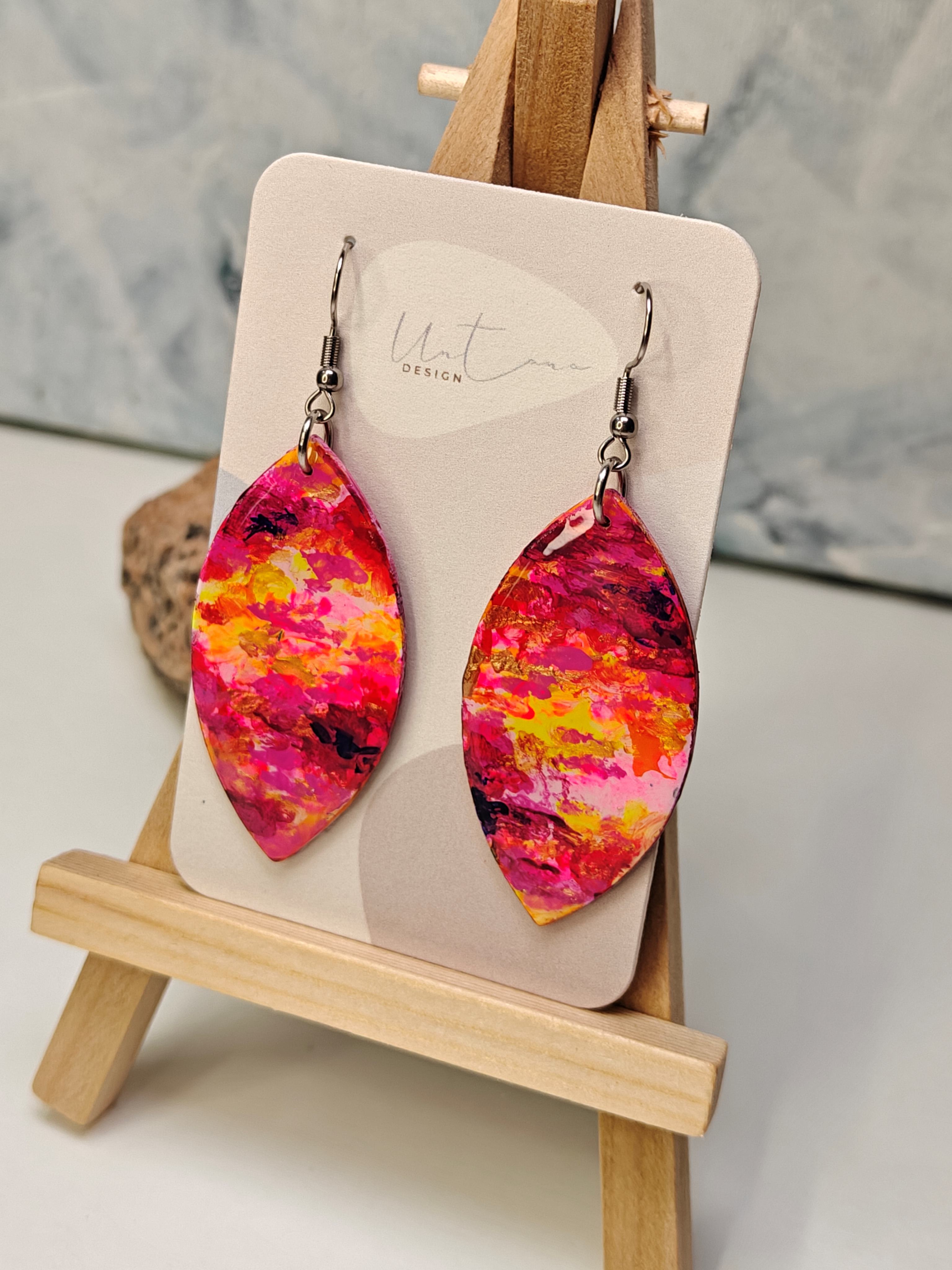 Kauniit käsintehdyt ja käsinmaalatut korvikset. Materiaali massaa, joka on pinnoitettu koruhartsilla sekä etu-, että takapuolelta. Koruosan korkeus 5 cm. Uniikki pari. Yhden korun paino noin 3 g.