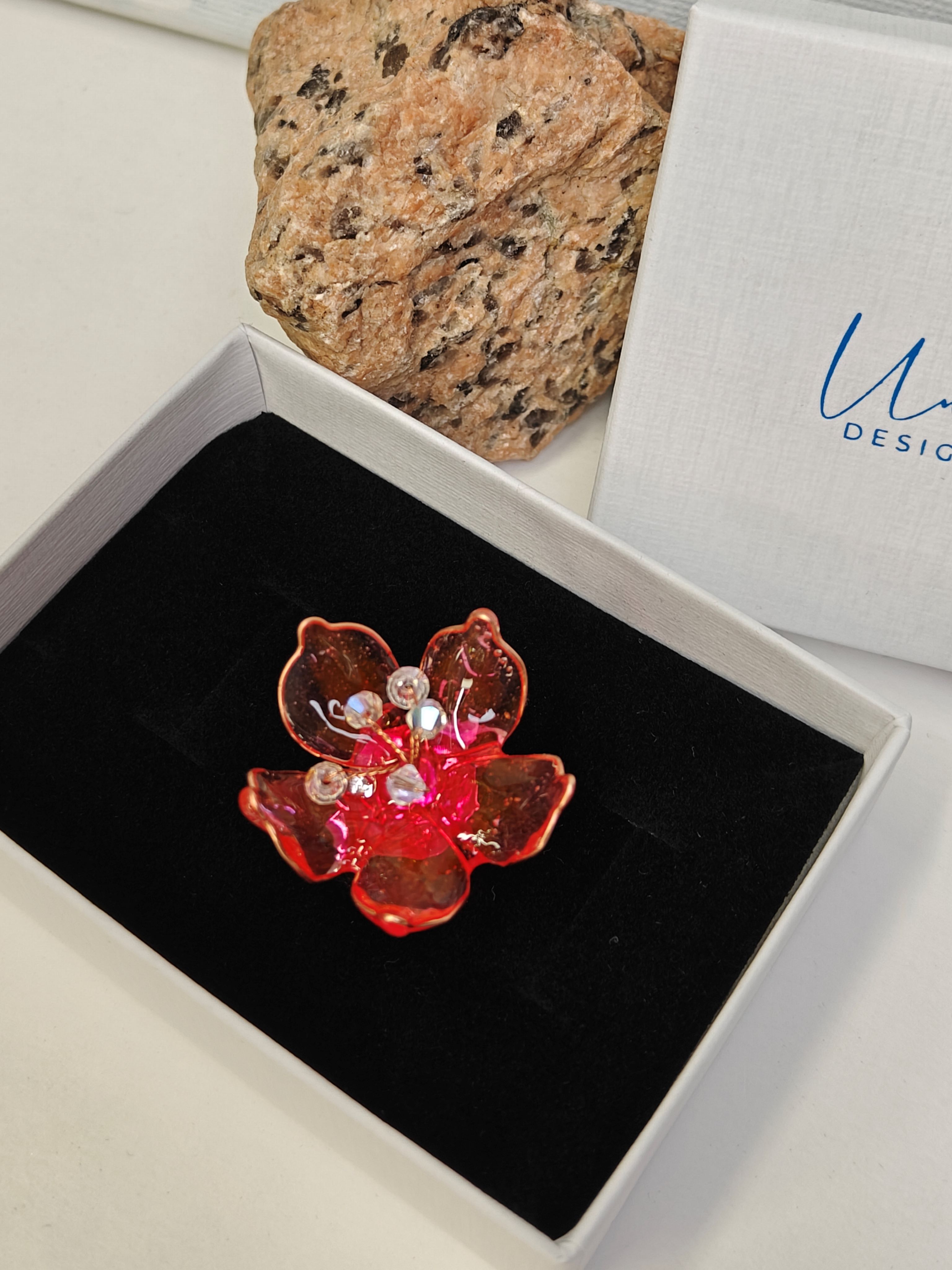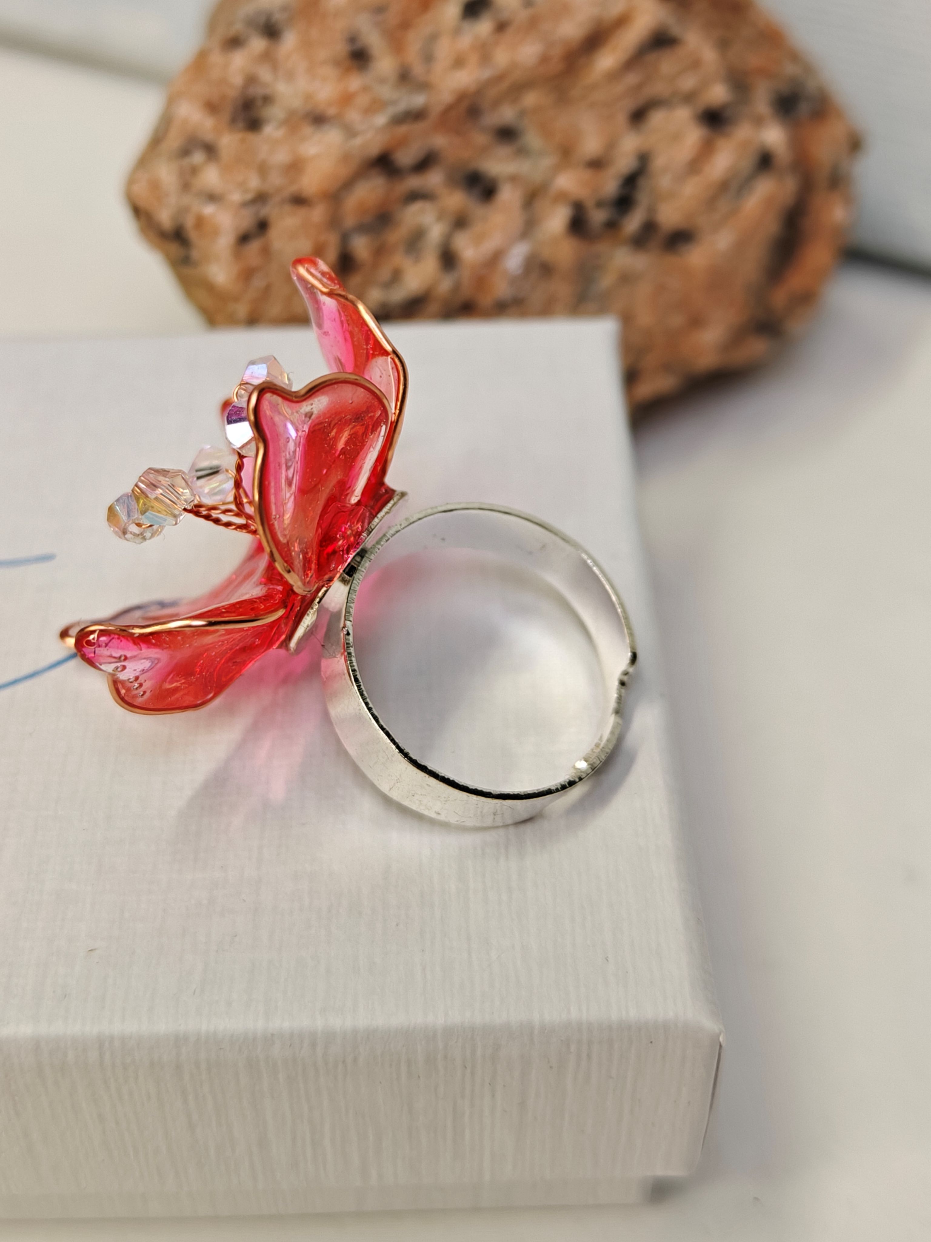 Ihana käsin tehty sormus. Materiaali koruhartsia, hopeoitu ja säädettävä. Kukan halkaisija noin 3 cm. Uniikki kappale.