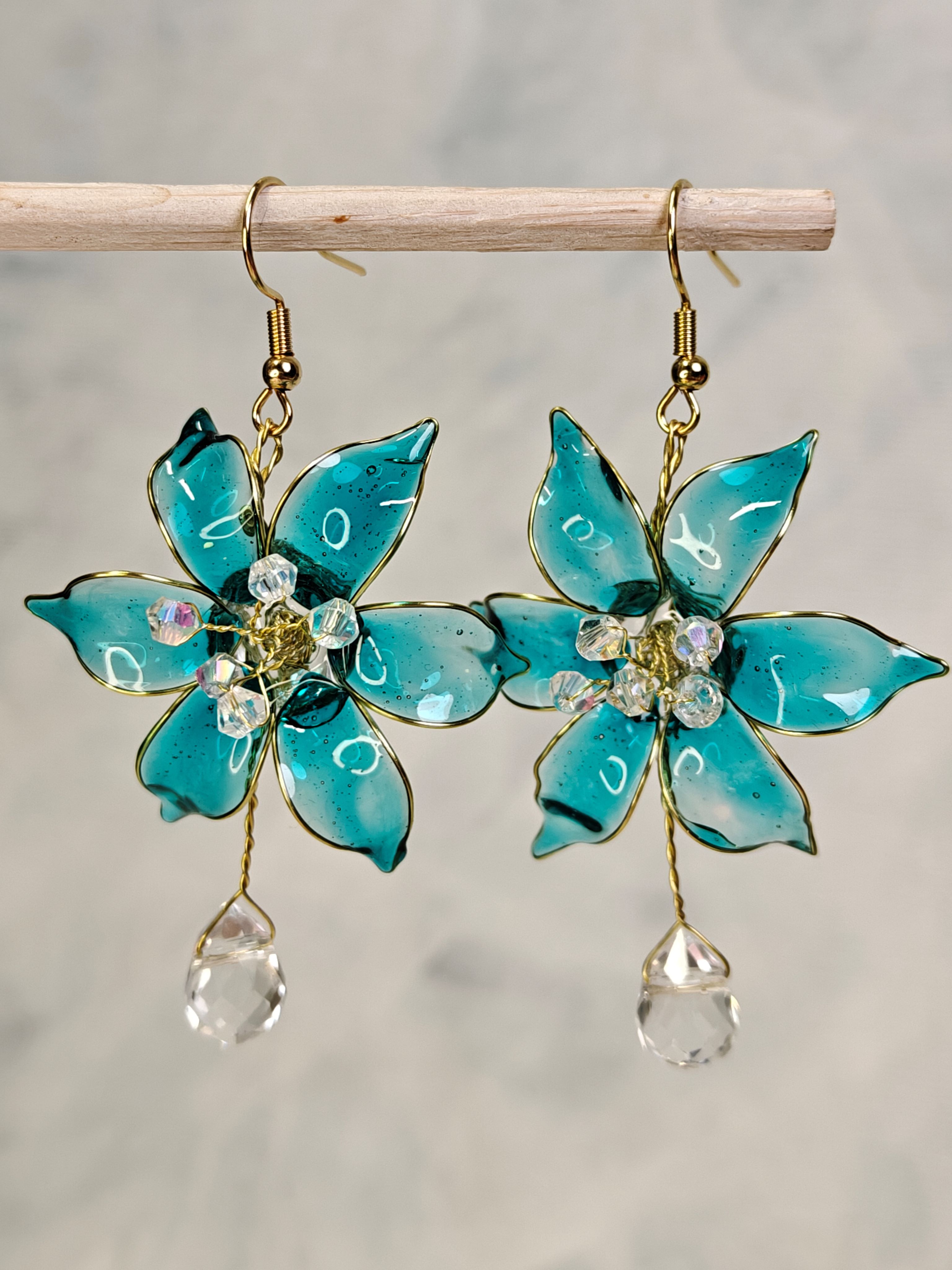 Kauniit dippaustekniikalla käsintehdyt korvakorut. Materiaali koruhartsia ja metallilankaa. Helmet yms lasia/muovia. Korun korkeus koukkuineen n. 7,5 cm. Koukut kirurginterästä tai kullattua kirurginterästä. Yhden korun paino noin 2-3 g. Mallia tehty 2 paria.