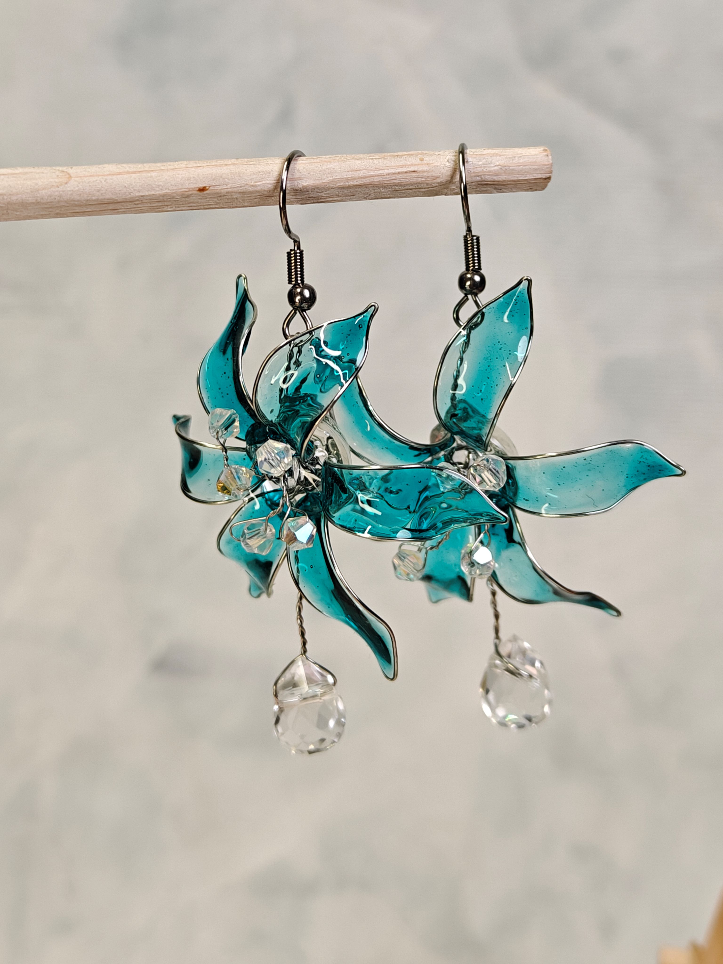 Kauniit dippaustekniikalla käsintehdyt korvakorut. Materiaali koruhartsia ja metallilankaa. Helmet yms lasia/muovia. Korun korkeus koukkuineen n. 7,5 cm. Koukut kirurginterästä tai kullattua kirurginterästä. Yhden korun paino noin 2-3 g. Mallia tehty 2 paria.