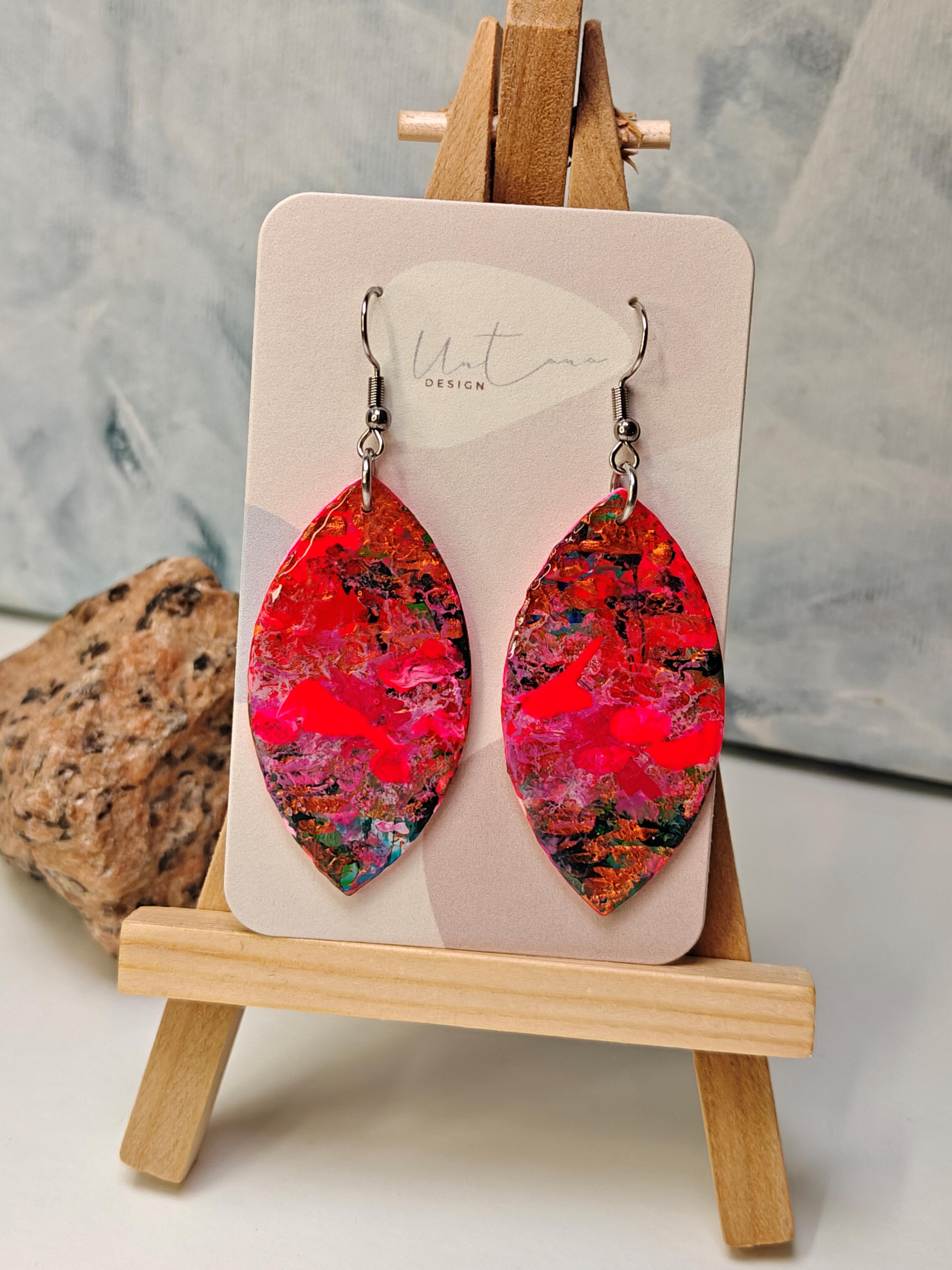 Kauniit käsintehdyt ja käsinmaalatut korvikset. Materiaali massaa, joka on pinnoitettu koruhartsilla sekä etu-, että takapuolelta. Koruosan korkeus 5 cm. Uniikki pari. Yhden korun paino noin 3 g.