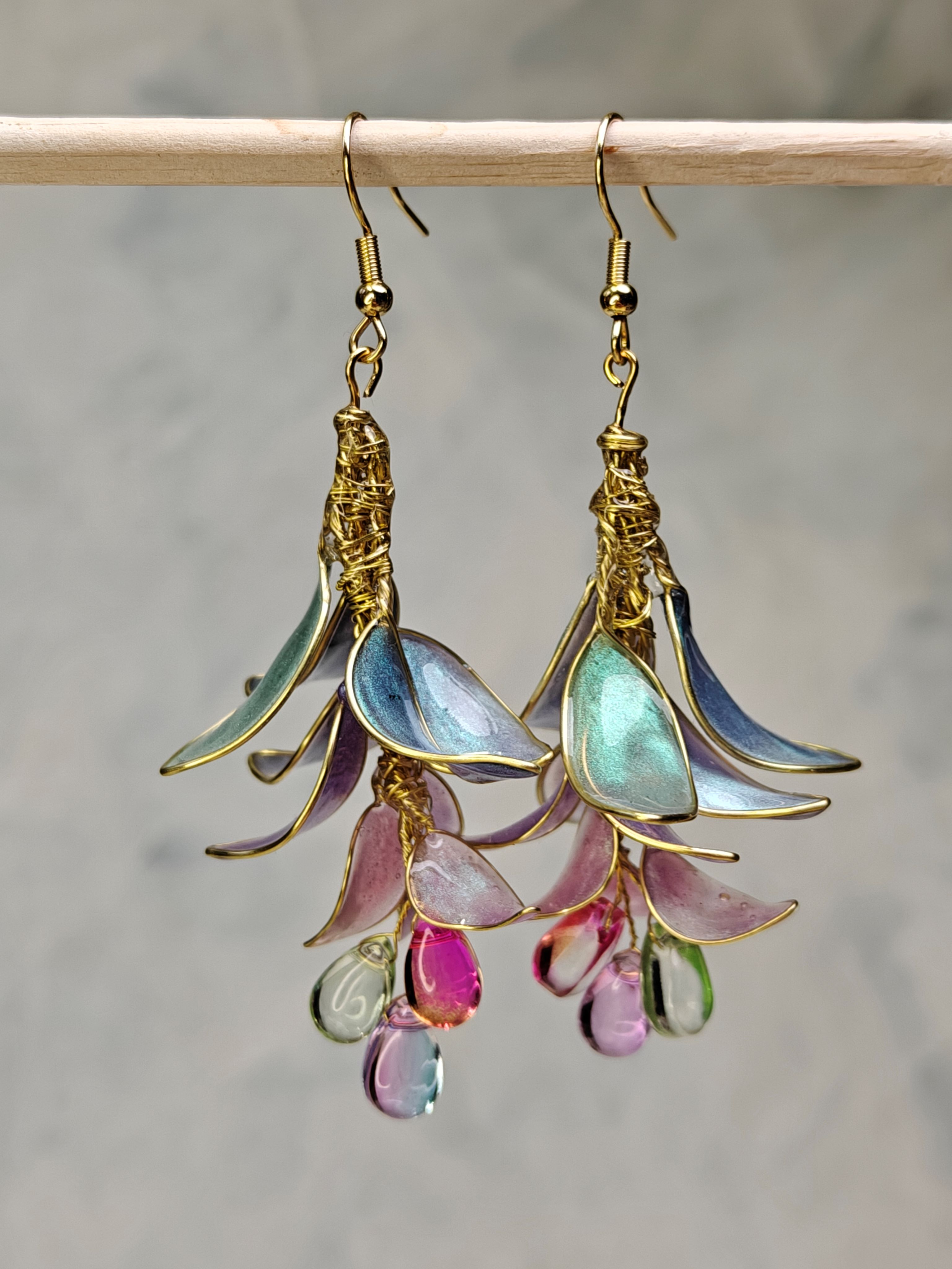 Kauniit käsintehdyt korvakorut. Materiaali koruhartsia, helmet lasia. Korun korkeus koukkuineen n. 7 cm. Koukut kullattua kirurginterästä. Yhden korun paino noin 3 g. Uniikki pari.