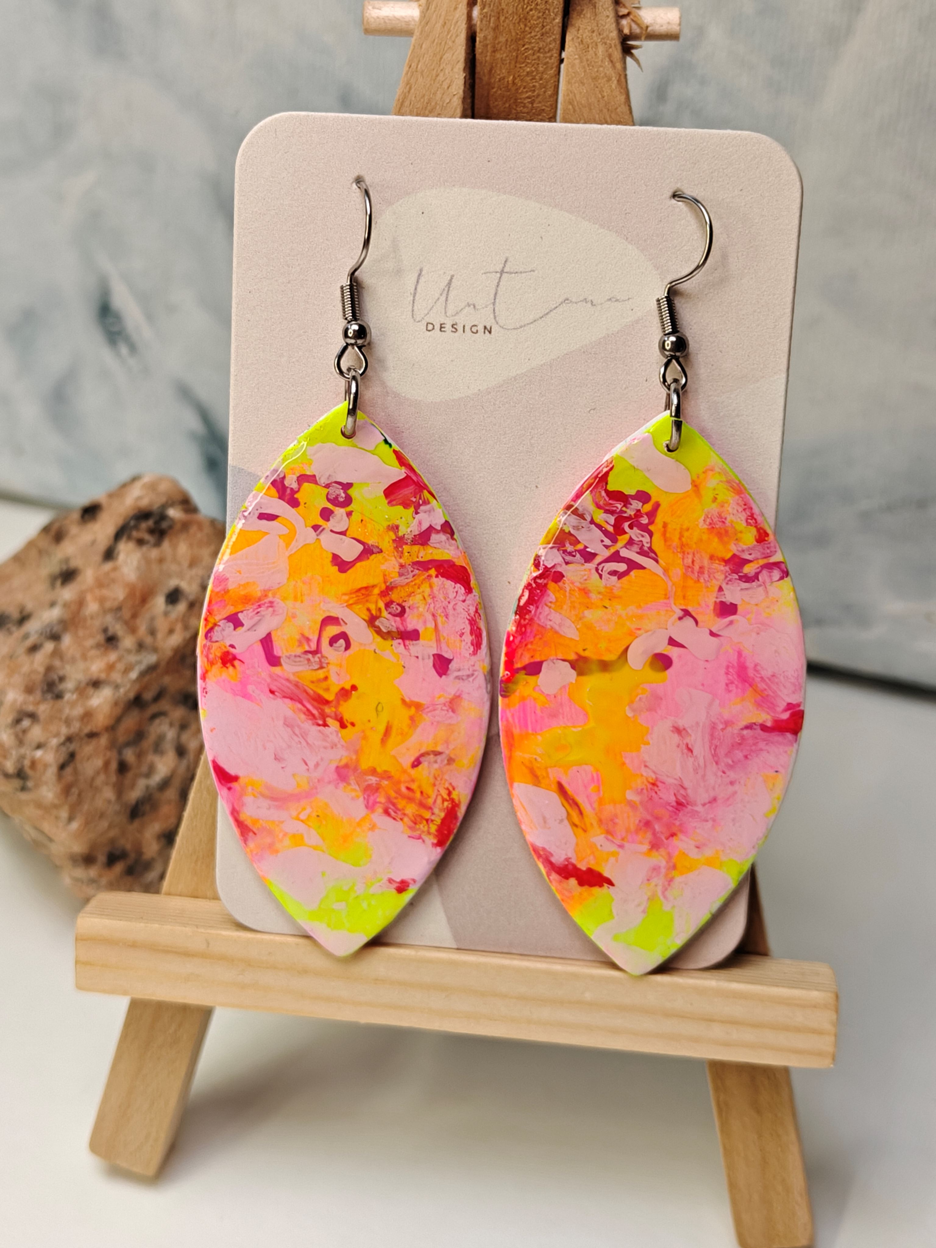 Kauniit käsintehdyt ja käsinmaalatut korvikset. Materiaali massaa, joka on pinnoitettu koruhartsilla sekä etu-, että takapuolelta. Koruosan korkeus 6 cm. Uniikki pari. Yhden korun paino noin 4 g.