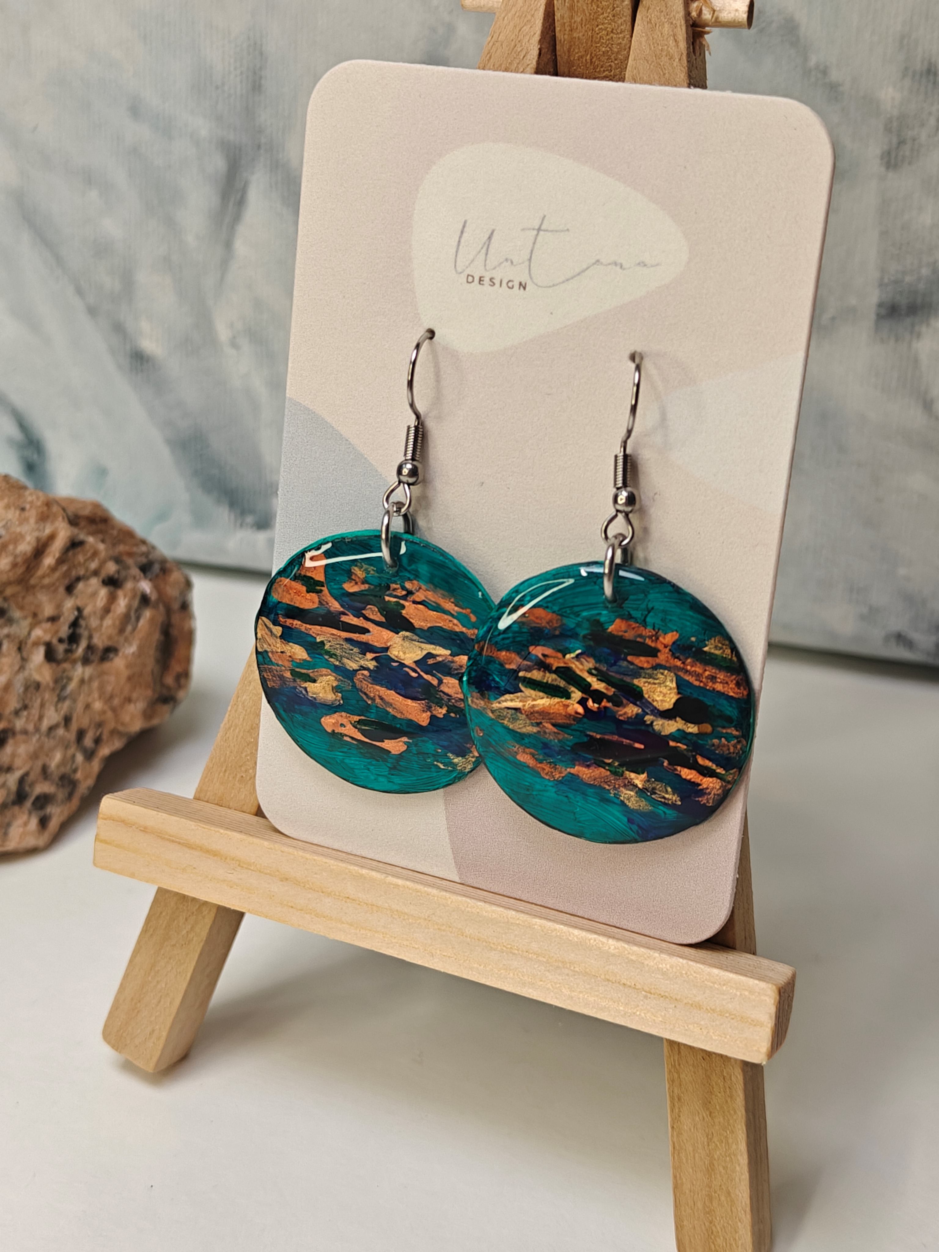 Kauniit käsintehdyt ja käsinmaalatut korvikset. Materiaali massaa, joka on pinnoitettu koruhartsilla sekä etu-, että takapuolelta. Koruosan halkaisija 3 cm. Uniikki pari. Yhden korun paino noin 3 g.