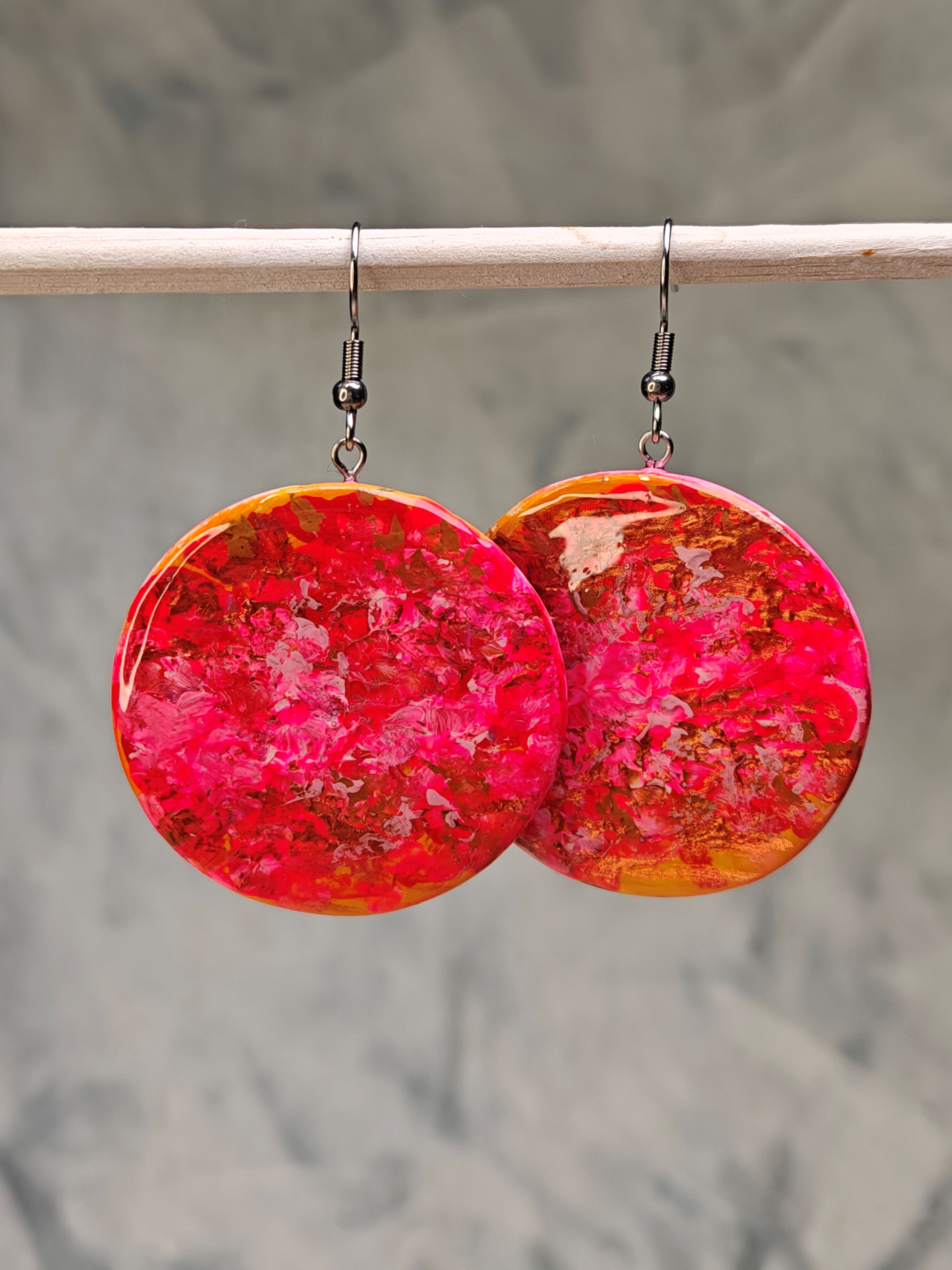 Kauniit käsintehdyt ja käsinmaalatut korvikset. Materiaali massaa, joka on kauttaaltaan pinnoitettu koruhartsilla. Koruosan halkaisija 4 cm. Uniikit ja numeroidut. Yhden korun paino noin 4 g.