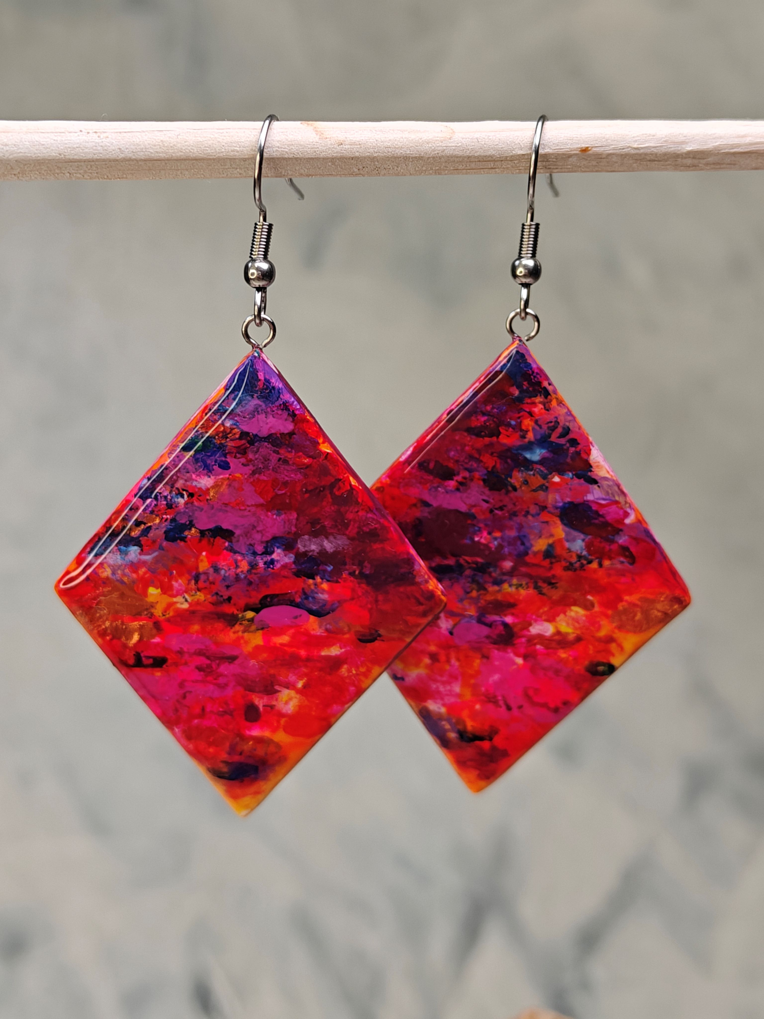 Kauniit käsintehdyt ja käsinmaalatut korvikset. Materiaali massaa, joka on kauttaaltaan pinnoitettu koruhartsilla. Koruosan korkeus 5 cm. Uniikit ja numeroidut. Yhden korun paino noin 4 g.