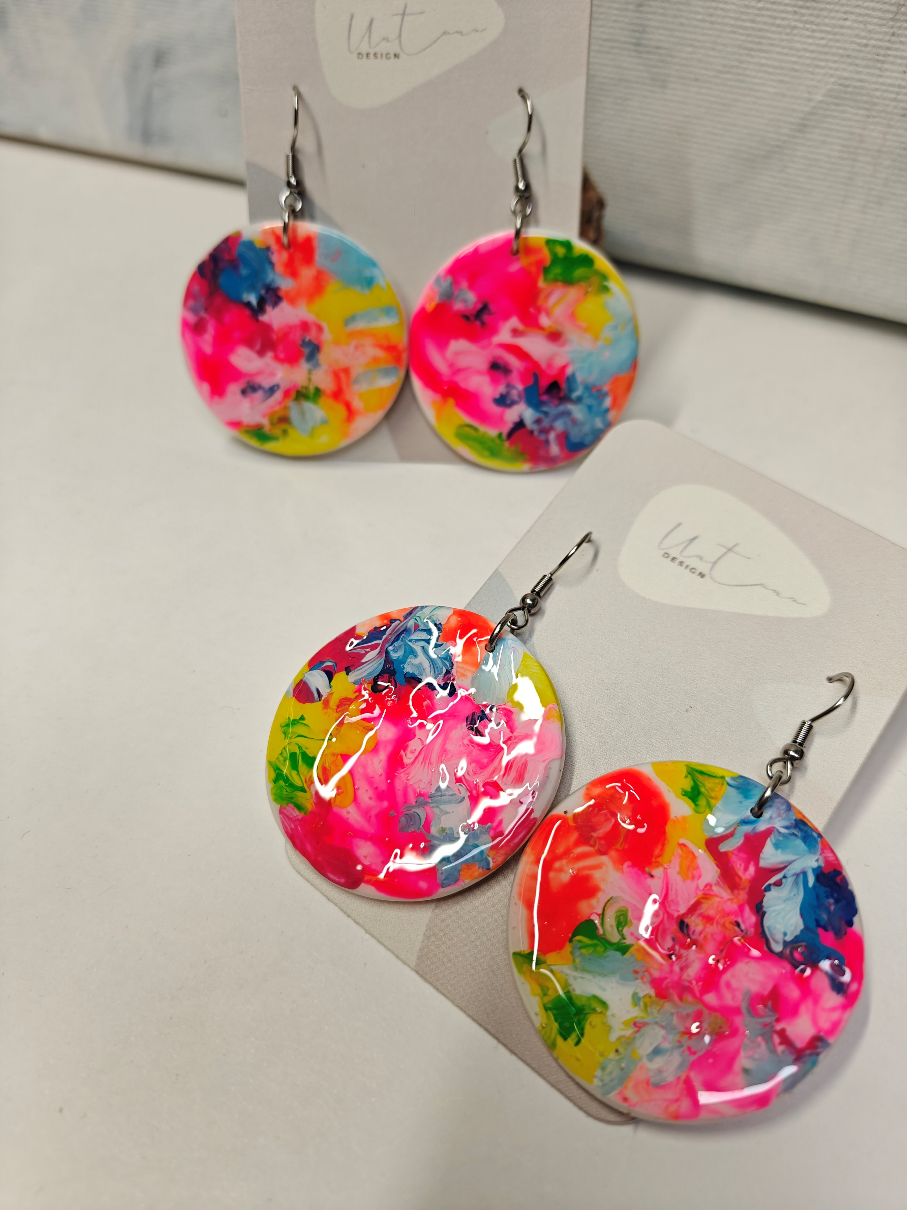 Kauniit käsintehdyt ja käsinmaalatut korvikset. Materiaali massaa, joka on kauttaaltaan pinnoitettu koruhartsilla. Koruosan halkaisija noin 4 cm. Yhden korun paino noin 5 g, koukut kirurginterästä.