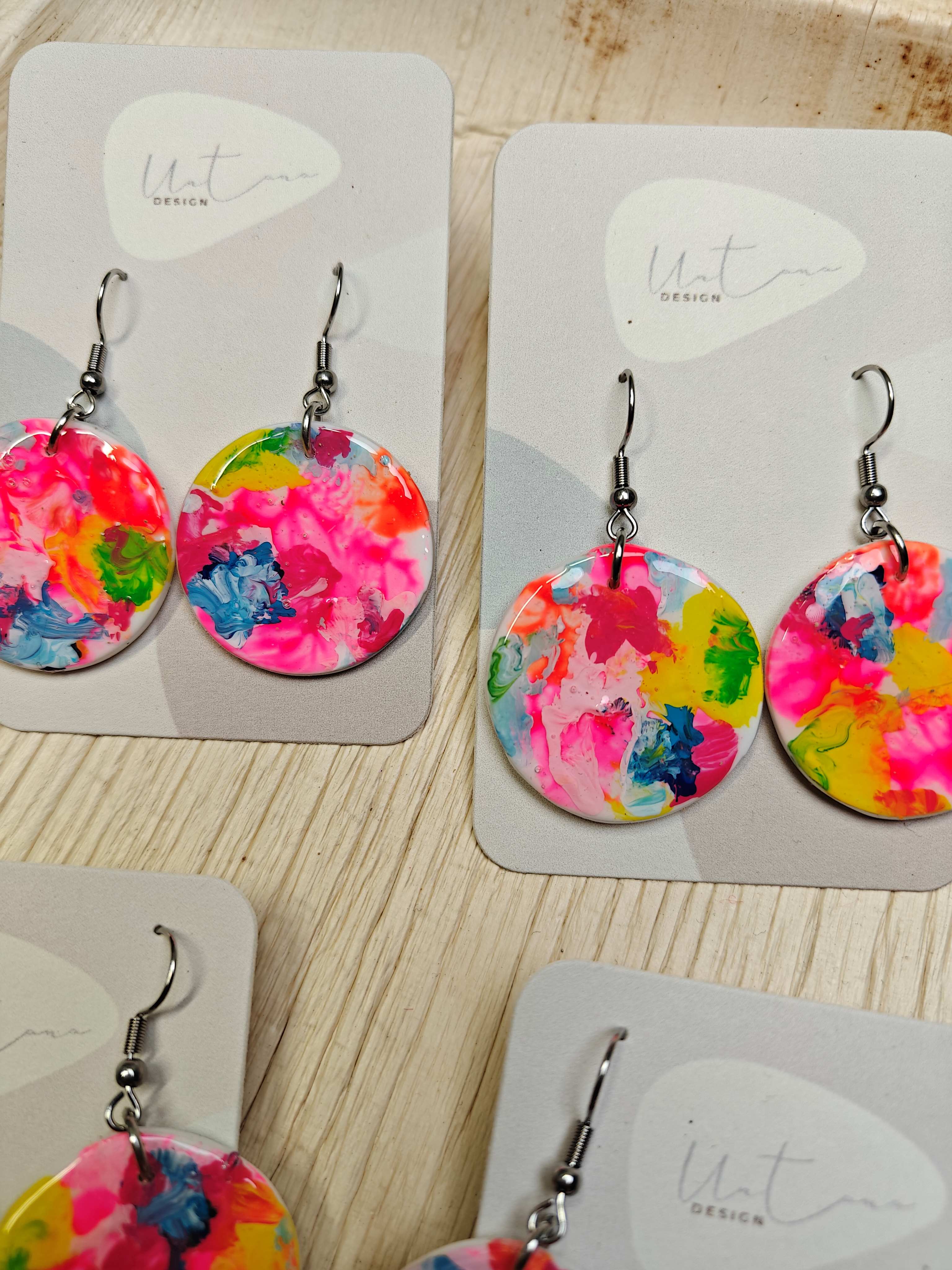 Kauniit käsintehdyt ja käsinmaalatut korvikset. Materiaali massaa, joka on kauttaaltaan pinnoitettu koruhartsilla. Koruosan halkaisija 3 cm. Yhden korun paino noin 3 g, koukut kirurginterästä.