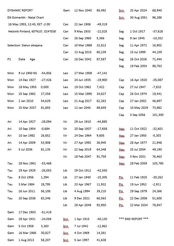 Sielun aikajana -listaus käsittää merkkisiirtymät 1900-luvun alusta vuosien päähän (n. 100vuotiaaksi asti). Tämän listauksen avulla pääset tutkimaan historiaasi.