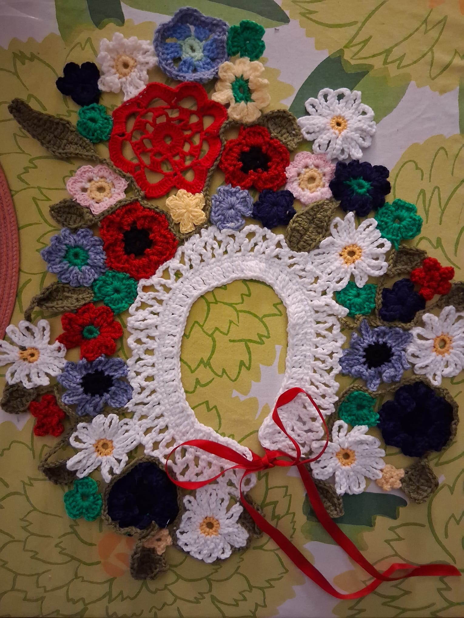 Kukkaketo kaulallani on irtokaulus, jonka voi lisätä sopivan yläosan päälle. Virkattu puuvilla ja sekoitelangasta, kukat koottu oman mallin mukaan. Satiininauhat, jotka voi sitoa kaulalle rusetille.